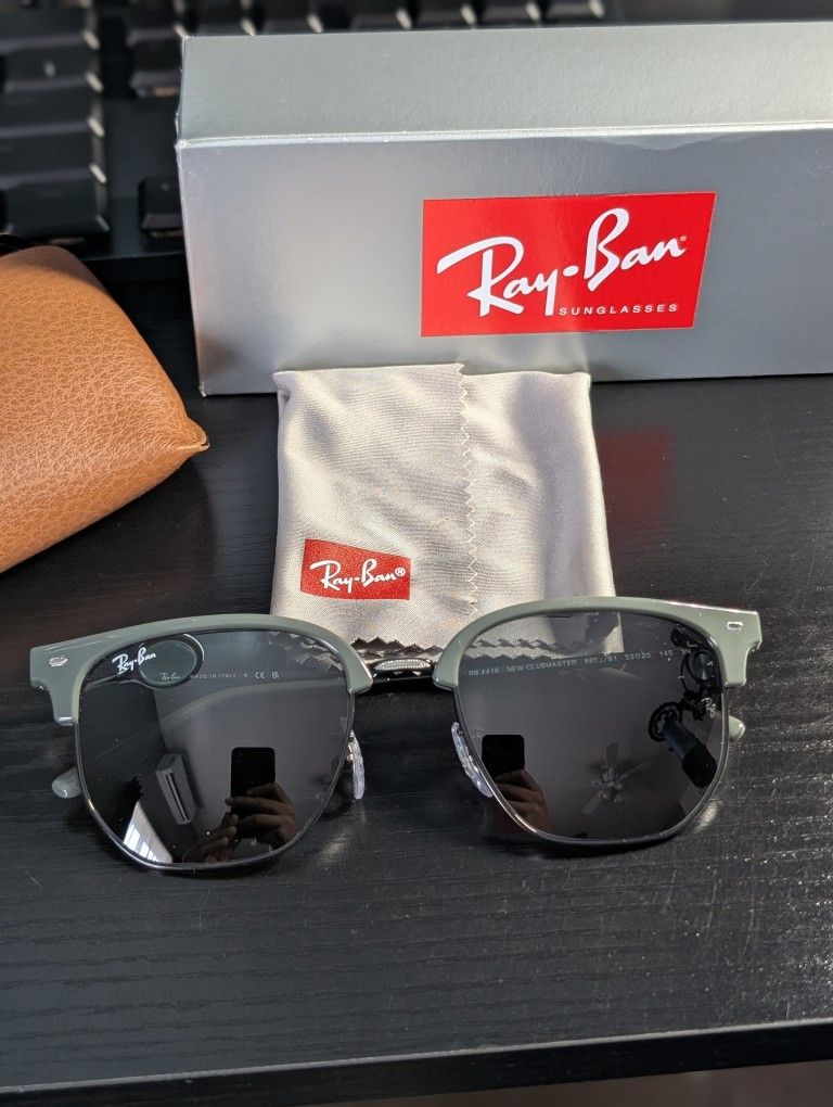Ray-Ban ORB4416 New Clubmaster in like-new, open-box condition. Only tried on once – no scratches, no wear. Details: Model: ORB4416 Color Frame: Grey on Black (Code: 6653B1) Lens Color: Dark Grey Size: 53 mm lens / 20 mm bridge / 145 mm temple Lens Category: 3N (100% UV protection – great for sunny days) Includes: ✅ Original Ray-Ban case ✅ Cleaning cloth ✅ Original box with label