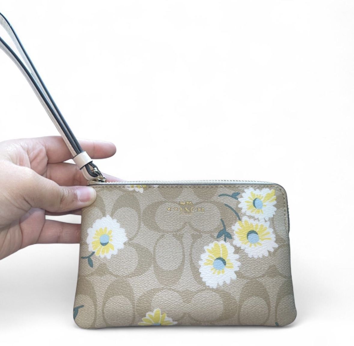 Coach tan floral wristlet wallet with white flowers and signature canvas. #floral #wristlet #coach