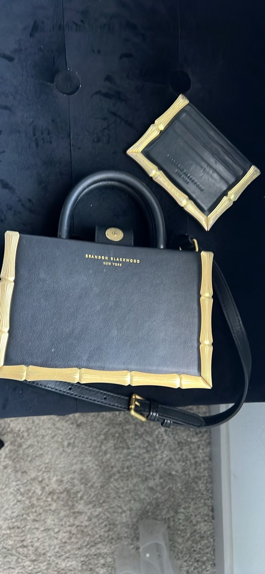 The iconic Bamboo earring inspired tote by Brandon Blackwood. Handbag is amazing condition and the wallet has some scuffs on the side of the metal.