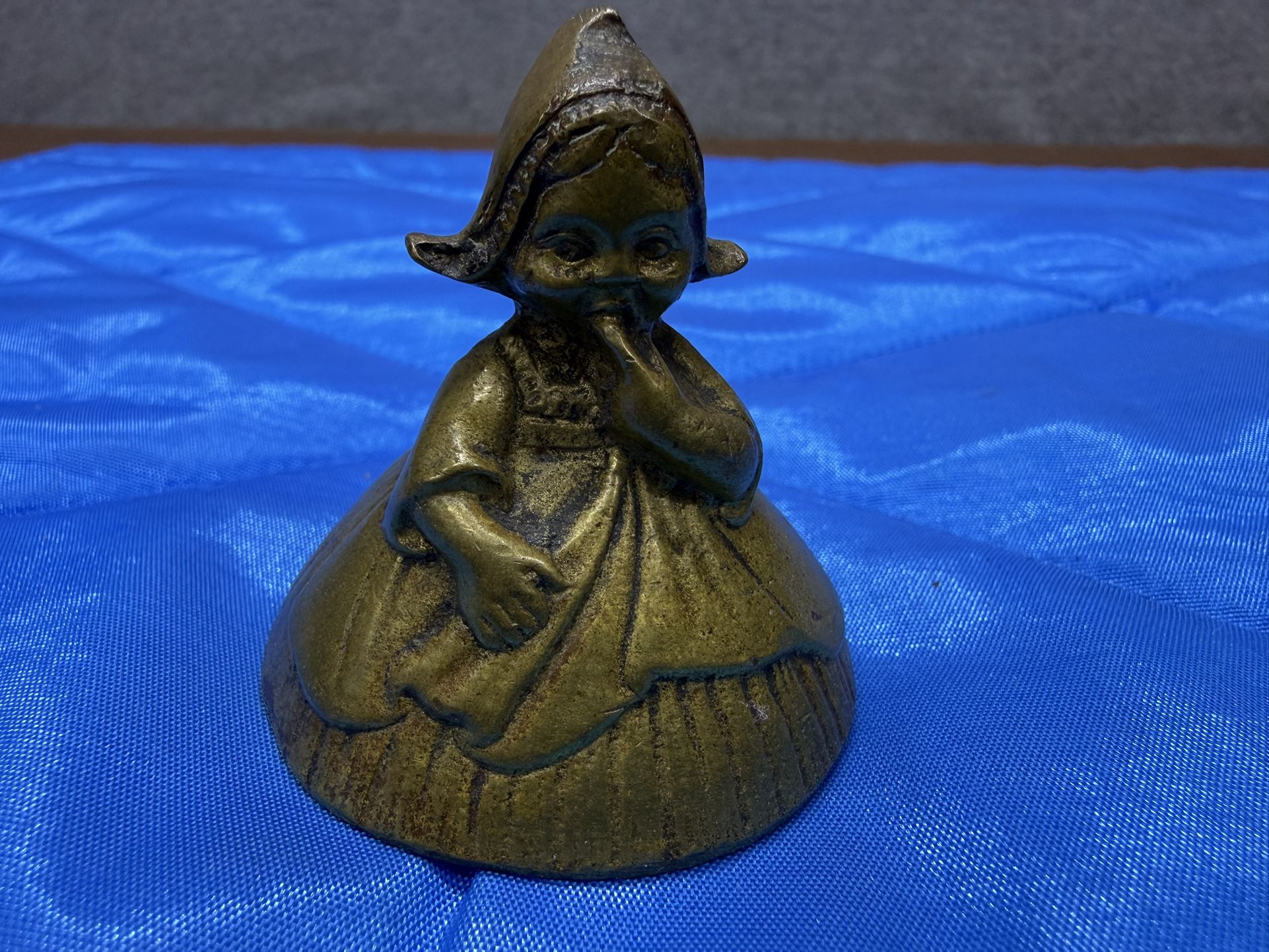 Vintage collectible figurine bell featuring a girl wearing a bonnet and dress. The bell is made of cast metal with an aged brass tone finish and includes the original clapper inside. A charming small decorative bell suitable for display or collection. Measurements Height: approx. 2 inches. Condition Good vintage condition with age-appropriate patina and wear. The bell rings and the clapper is present.