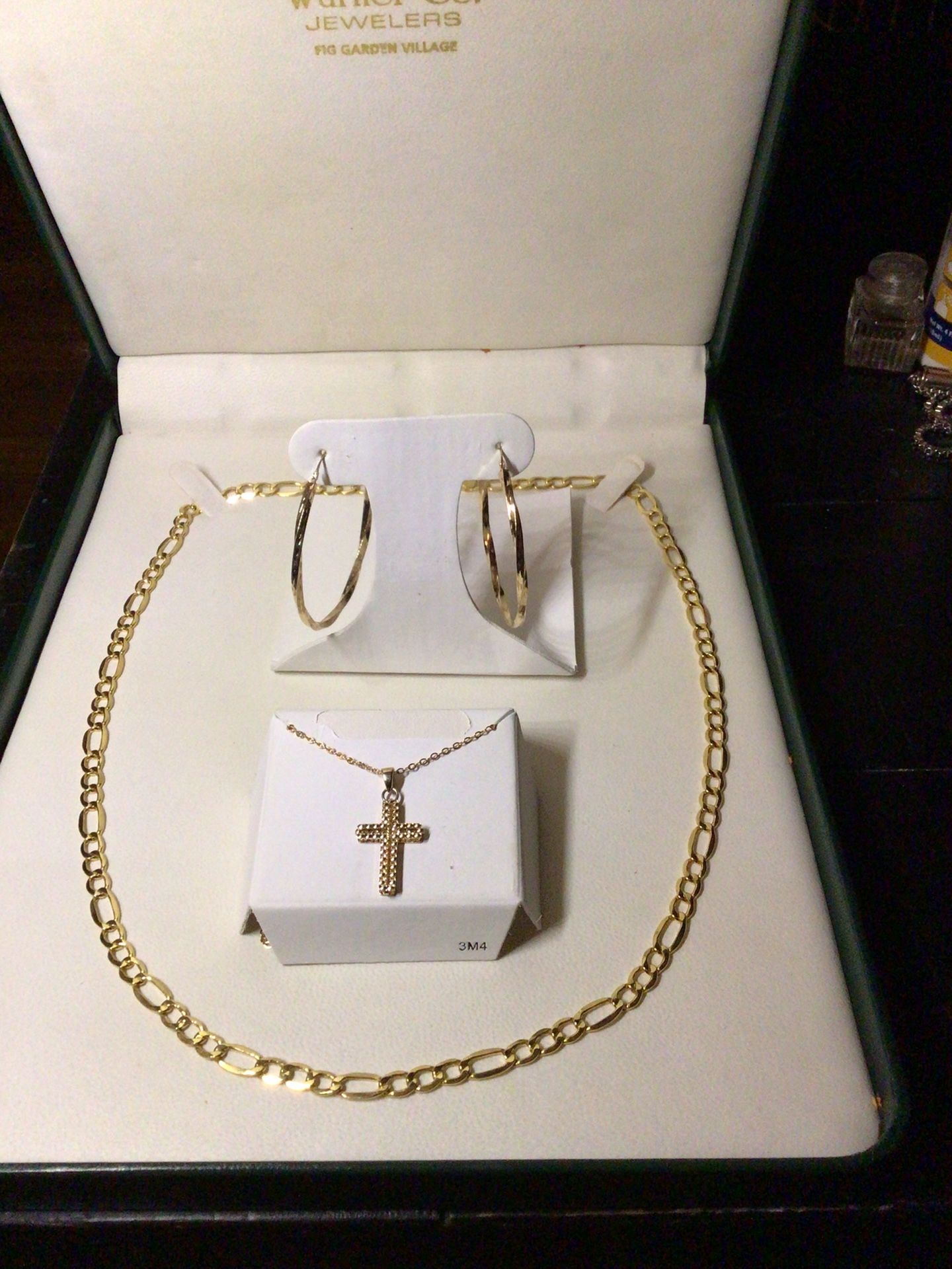 Chain in 22 inches. Hoops are 2-3 inches round. 1 inch cross pendant All 3 are 10k yellow gold fin jewelry. 400 for the chain 200 for hoops 150 for Cross. Willing to negotiate and bundle if you take all three.
