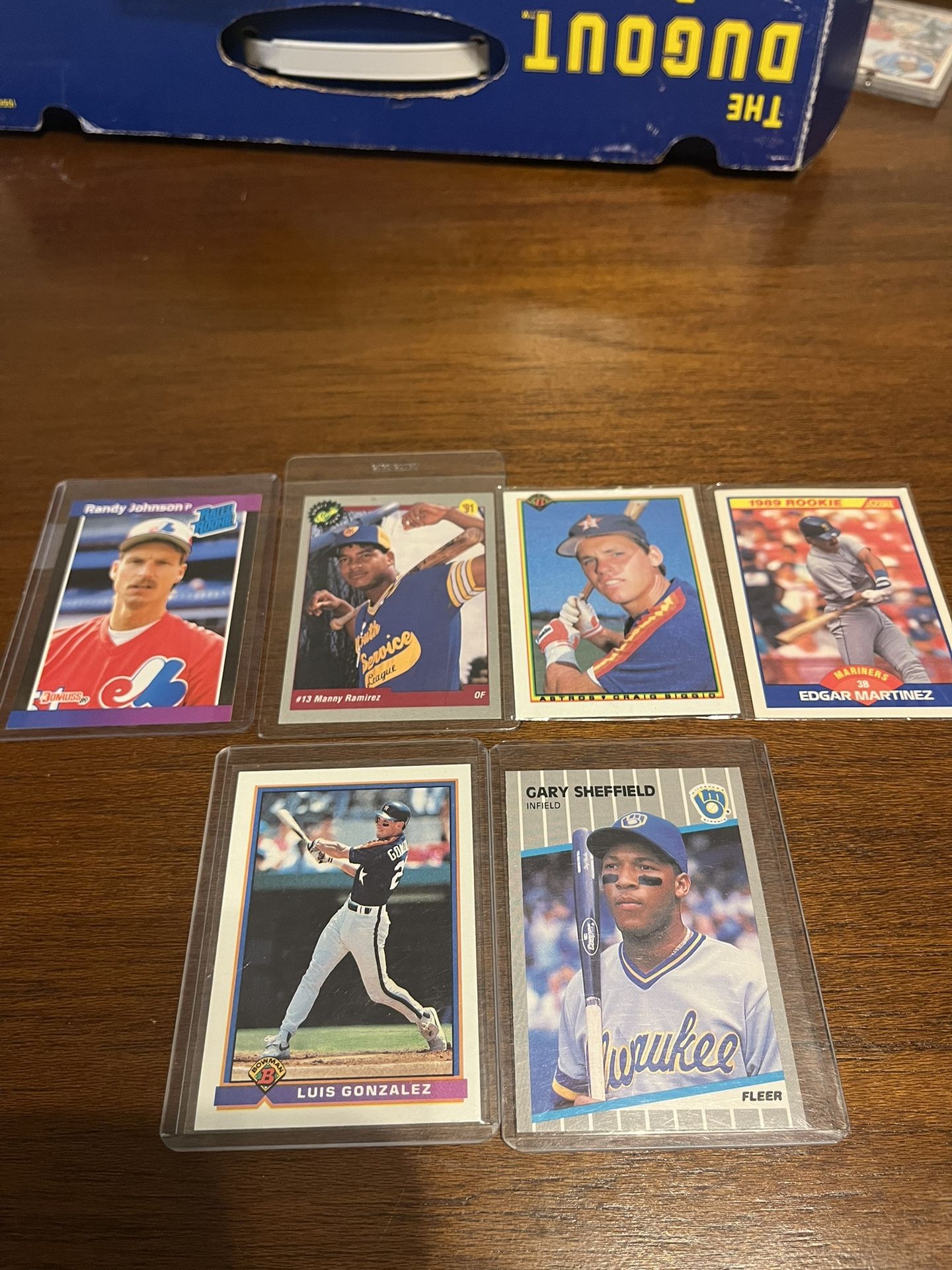 Randy Johnson, Gary Sheffield, Manny Ramirez, Luis Gonzalez, Edgar Martinez, and Craig Biggio rookie cards. Also have Nolan Ryan, Roger Clemens. Cal Ripken, Dave Parker, and Wade Boggs