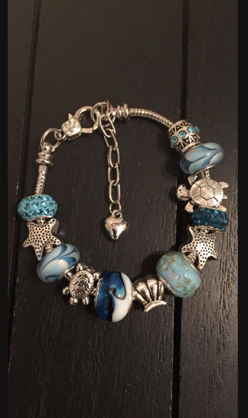 7” Ocean Wave 925 Silver Plated Charm Bracelet with Murano Glass Beads and Austrian Crystal Beads (seashell, turtle, starfish, heart)