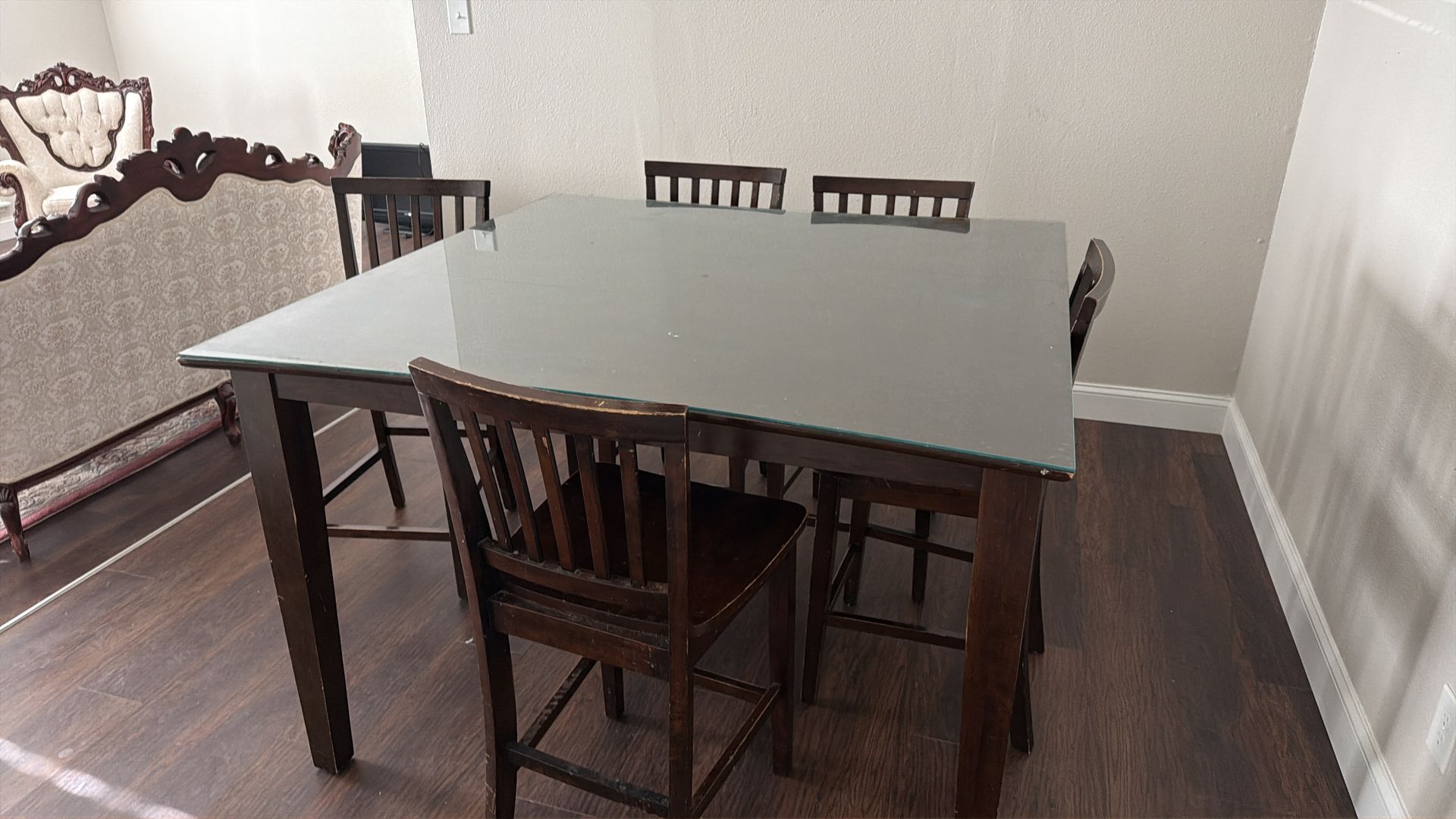 Solid wood dining table set with 6 matching chairs and a sleek glass tabletop. The dark wood finish gives it a clean, modern look, while the glass top adds a touch of elegance and makes it easy to clean. The set is sturdy and in good condition. Chairs are comfortable and well-built, with minor signs of normal use. Perfect for a dining room, breakfast area, or even a workspace setup.