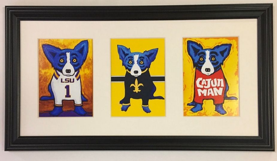 Paid 350$ new for both. Will accept Zelle payments for shipping $185 for both as combo. 200$ for shipping anywhere in the states.. FRAMED postcard replicas of original Blue Dog art created by George Rodrigue Left to Right: "A NUMBER ONE TIGER FAN" (All proceeds from the sales of the original silkscreen poster benefited the Tiger Athletic Foundation (TAF), the George Rodrigue Foundation of the Arts (GRFA), the LSU Museum of Art (LSUMOA) and Louisiana State University. "WE ARE MARCHING AGAIN" (After Hurricane Katrina the artist teamed up with the New Orleans Saints to promote this original silkscreen print for "Blue Dog Relief" with proceeds from sales benefiting New Orleans arts and music organizations. “CAJUN MAN" (Original art created by the artist in 2006 as a silkscreen poster edition of 250 prints.) _____________________________________________________ PROFESSIONALLY FRAMED IN A: 1.25" BLACK TRADITIONAL wooden frame (Overall Size 22" x 12") Matted with a WHITE acid free mat George Rodrigue's Blue Dog " Red, White & Blue Dog Series Set of (3) Note Cards Collage Professionally framed & matted. The Note Cards have long been out of print and pretty hard to find these days. The (3) Note Cards in the set are ::: Star Spangled Blue Dog, Land That I Love, and Stripes. Overall size of the frame is roughly 21” wide x 11” high. Framed in a satin black frame and matted with acid free mats.....Simply beautiful. Thanks for looking..