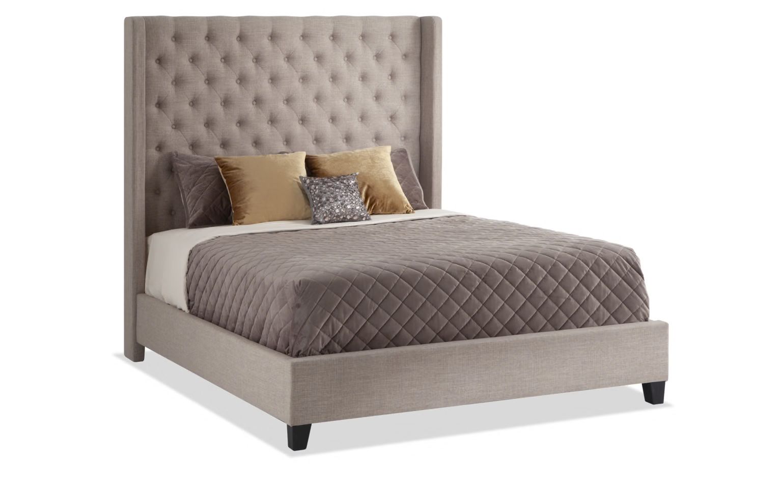 Queen Sized Bed Frame And Headboard Tan color Velvety material Picture shown approximate to actual condition Pillows and duvet not included