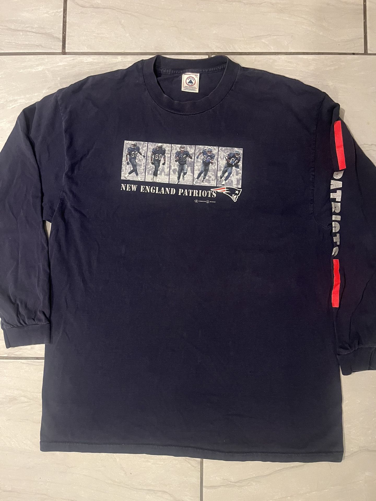 Craziest box logo NFL Player graphic print on front, sz XL long sleeve with New England patriots sleeve hit. Great condition for the year 2000. Very light cracking on print. Player Terry Glenn #88 catching a ball and running. Very rare! GO PATS!! Measurements: 22.5” x 30 1/4”. This vintage long sleeve shirt features the New England Patriots' iconic box logo, making it a rare and unique piece for any fan. Officially licensed by the NFL, this navy blue shirt in size XL is perfect for showcasing your support for the team. With Terry Glenn's name and image prominently displayed, this unisex adult shirt is a must-have for any football enthusiast looking to add a nostalgic touch to their fan apparel collection.