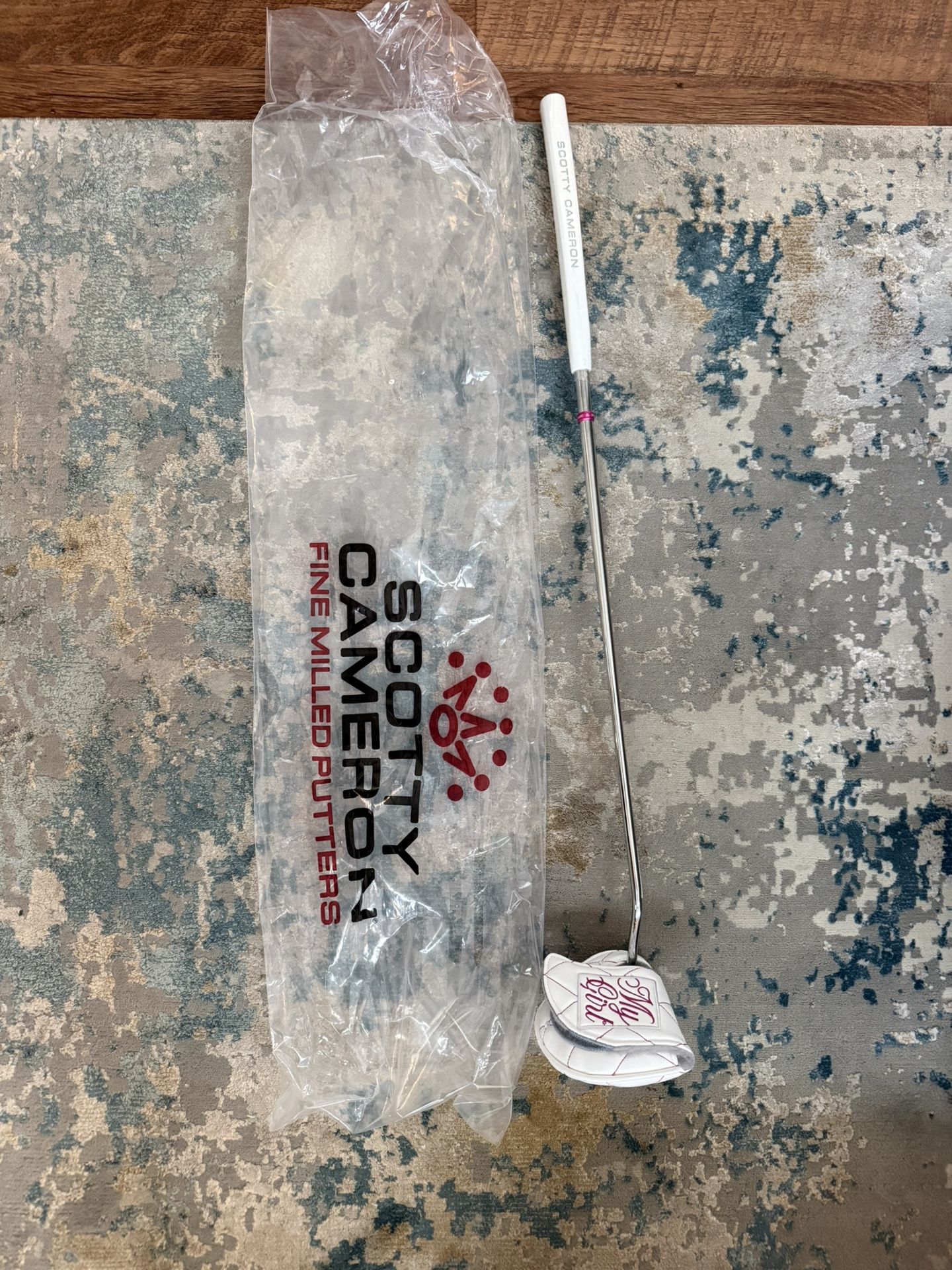 The product is a limited release 34" right-handed Scotty Cameron MY GIRL "Pink & Pearls" putter. This stylish and high-quality golf club features a feminine pink color with pearl accents, making it a unique and eye-catching option for any golfer. With a loft of 4 degrees and the renowned Scotty Cameron brand, this putter is sure to improve your game and make a statement on the golf course.