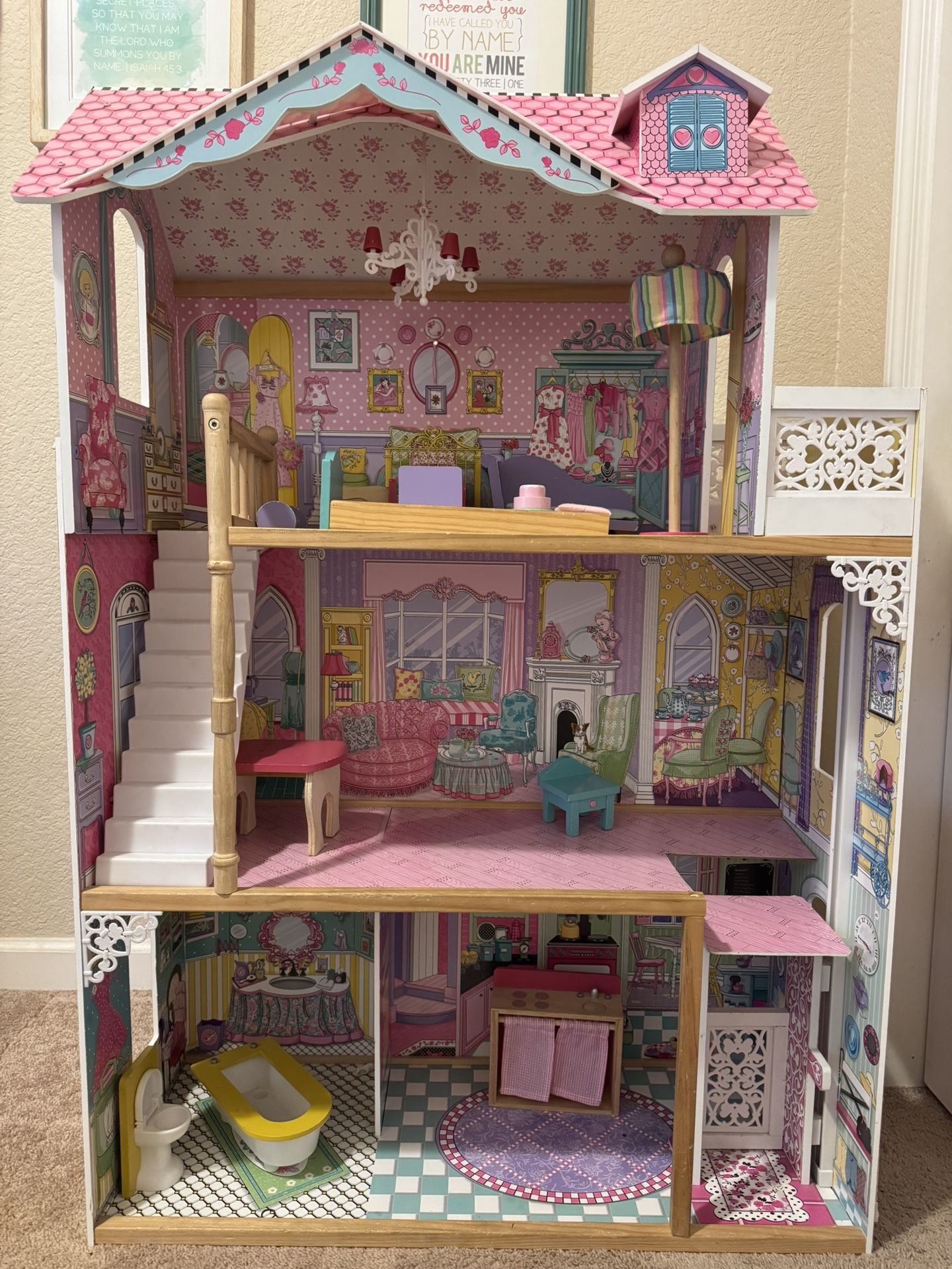 Used with normal wear and tear. Structure still sturdy. PRODUCT FEATURES Multiple rooms and 16 pieces of furniture Heart-shaped latticework Hanging chandelier Wide windows Sturdy wooden construction PRODUCT DETAILS 47"H x 16"W x 35"D Ages 3 years & up Accommodates dolls up to 12-in. tall