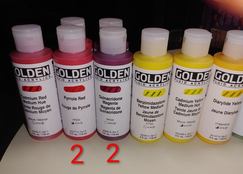 GOLDEN FLUID ACRYLICS MULTIPLE COLORS, ALL BRAND NEW!! 💵 SELLING FOR: $300 💵 SERIOUS INQUIRIES ONLY PLEASE 29 COLORS: 1- Cadmium Red Medium Hue 2- Pyrrole Red 2- Quinacridone Magenta 1- Benzimidazole Yellow Medium 1- Cadmium Yellow Medium Hue 1- Diarylide Yellow 1- Green Gold 2- Phthalo Blue 2- Teal 2- Manganese Blue Hue 1- Turquoise 1- Alizarin Crimson Hue 2- Dioxazine Purple 1- Raw Umber 1- Payne's Gray 2- Bone Black 2- Carbon Black 1- Iridescent Pearl (Fine) 1- Zinc White 2- Titanium White DETAILS: These highly intense permanent acrylic paints by Golden Fluid have a consistency similar to heavy cream. It's also comprised of a pourable, low viscosity formula. Ideal for spraying, brushing, or staining, it can also be mixed with other paints and media for additional applications. Fluids blend easily with all acrylic colors, and readily tint gels, mediums, gessoes and grounds. Fluid Acrylics are extremely versatile, and ideal for fine brushwork, glazing, staining, water media techniques, and much more. - Low viscosity - Permanent - Conforms to ASTM-D 5098 - For mixed media.