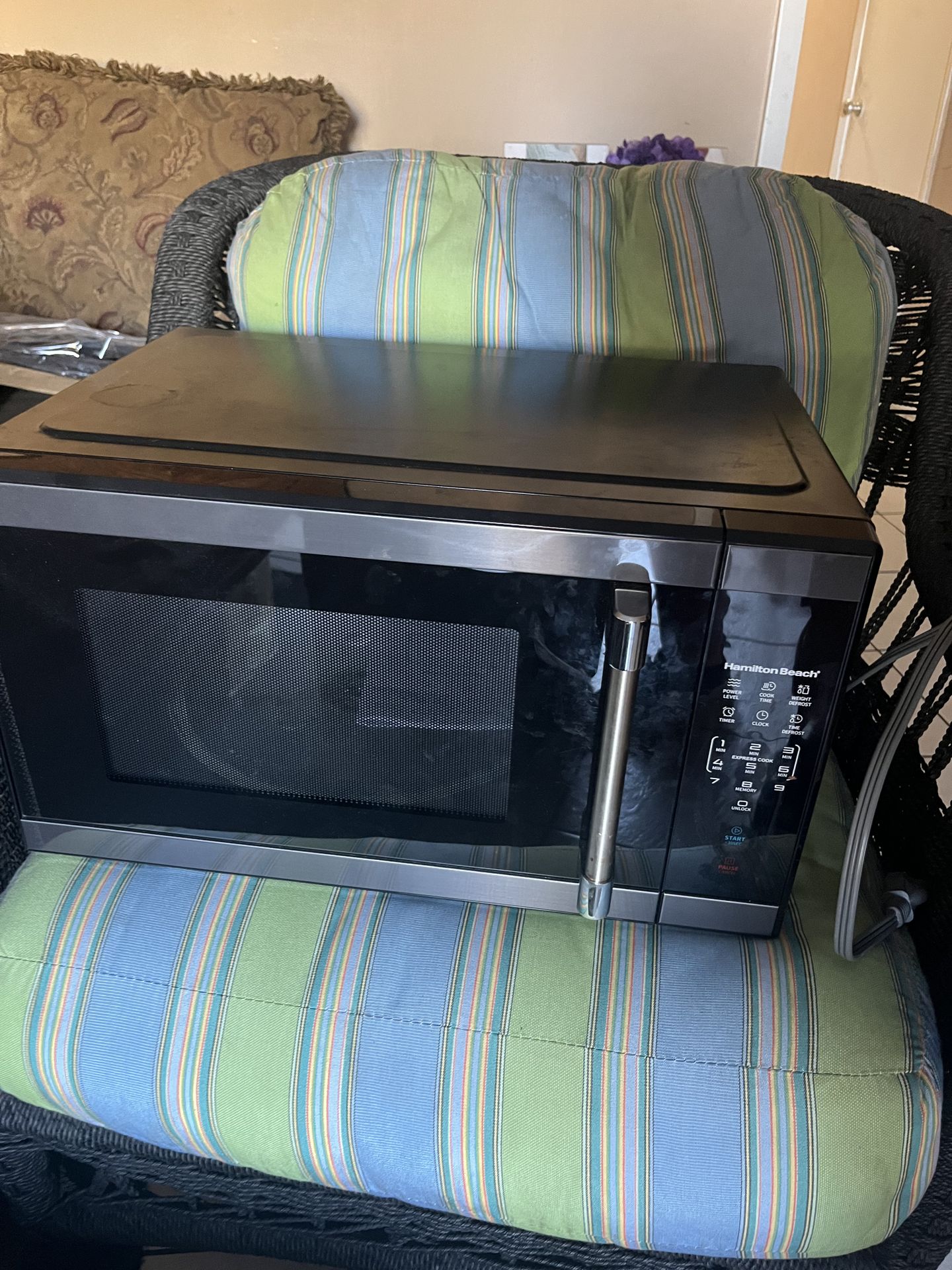 Hamilton Beach Microwave 1000W – Great condition Works perfectly, all functions working. Includes glass turntable. Medium size, perfect for kitchen or apartment. Approx dimensions: 20” W x 12” H x 16” D Ready to use. Microondas Hamilton Beach 1000W – Excelente estado Funciona perfectamente, todas las funciones operativas. Incluye plato de vidrio. Tamaño mediano ideal para cocina o apartamento. Medidas aproximadas: 20” ancho x 12” alto x 16” fondo Listo para usar.