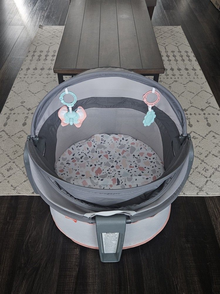 Your baby will feel right at home in the dome! That's because it features a comfy pad for your little one to nap or play on and a canopy that protects against the sun and bugs so you can use it indoors or out! Two colorful toys dangle overhead to encourage eye tracking. Plus when you're ready to go, just fold the dome, grab the handles, and you're off! 2-in-1, play space & napping spot for baby! Can be used indoors or out Adjustable canopy protects against bugs & sun (UPF 20) 2 linking toys overhead Folds flat, with handles for easy take-along