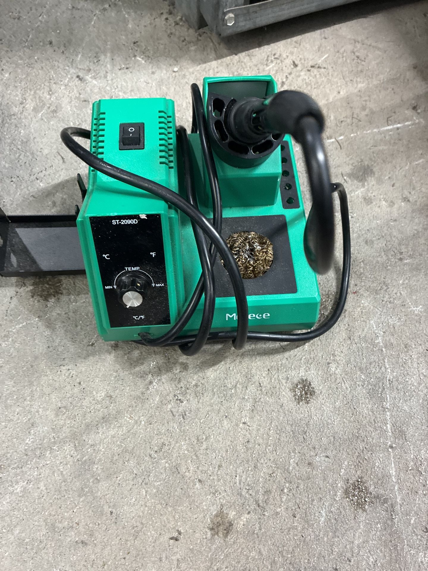 Functional soldering station up for grabs. It's a Merece ST-2090D model. Has temperature control, you can switch between Celsius and Fahrenheit. Comes with a holder for the iron and a brass tip cleaner. Good for all your soldering needs.