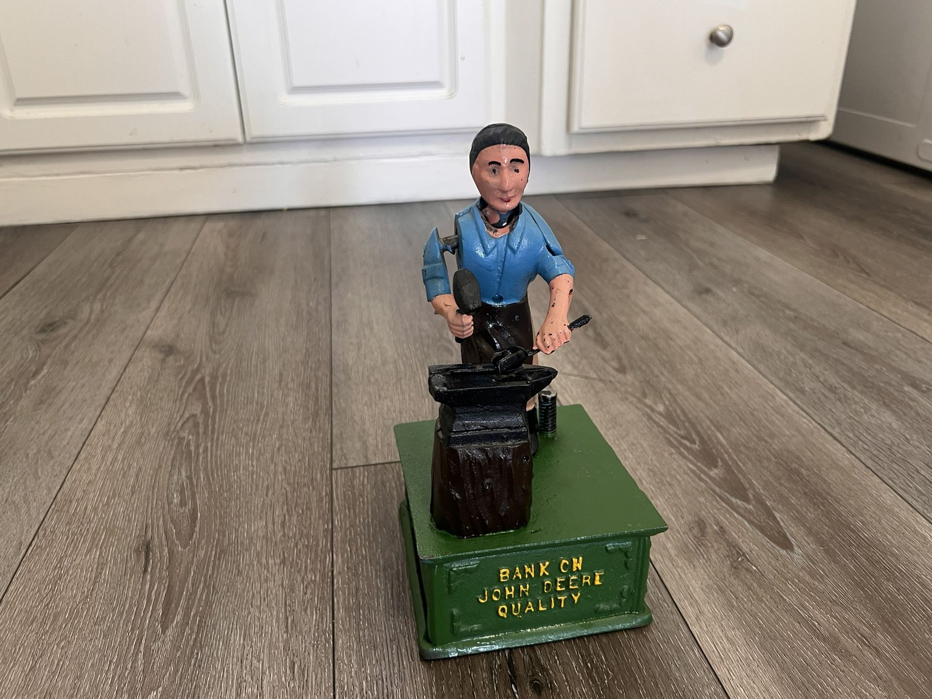 Vintage Bank on John Deere Quality cast iron mechanical blacksmith w/ anvil coin bank Great Working Condition