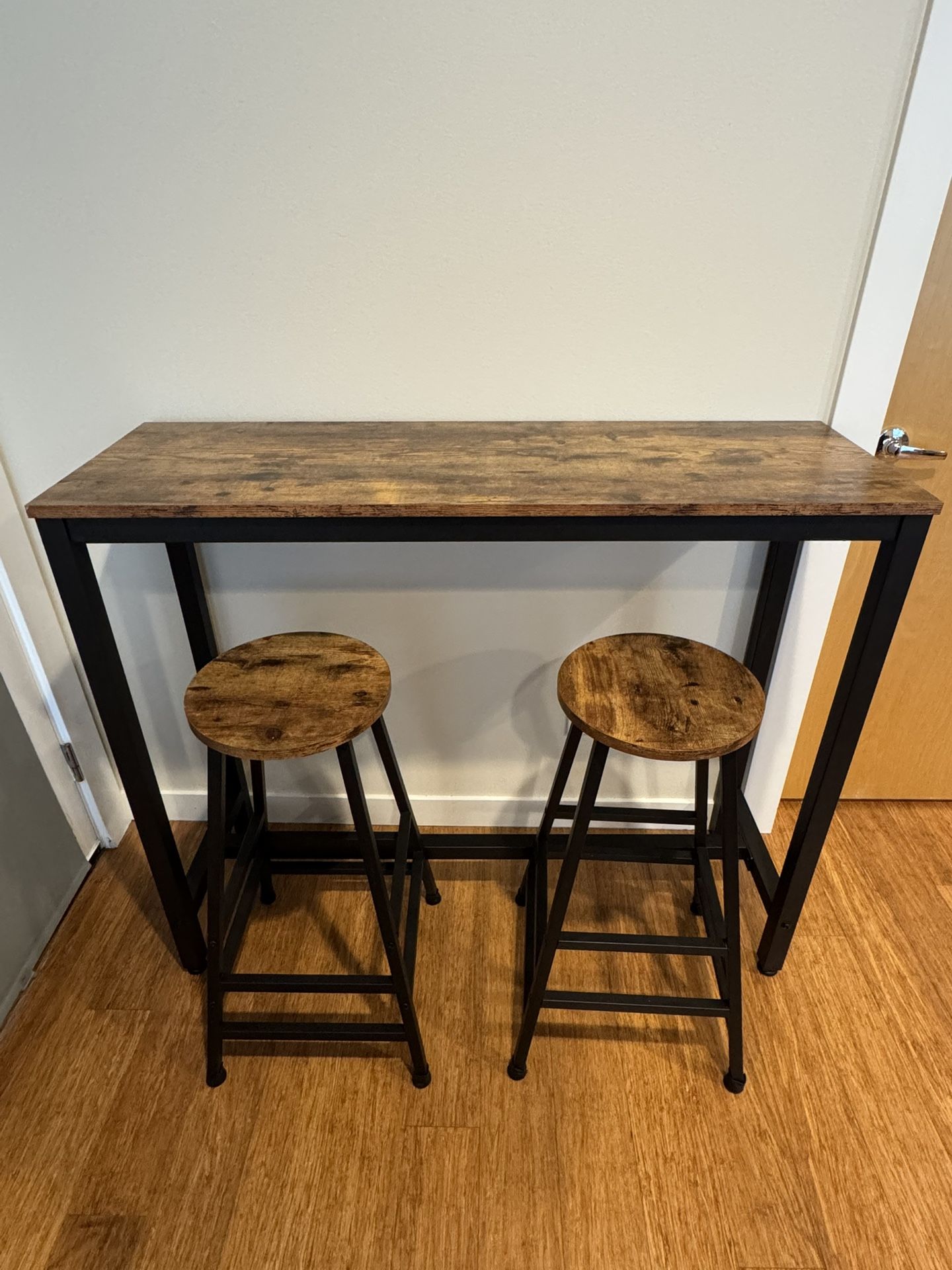 Bar Table Set of 3, Bar Table and Stools Set of 2 Color: Vintage brown -material : MDF board and metal -table dimension : 47.2*15.7*39.4 inch -bar stool dimension :11.8*11.8*28.5 inch