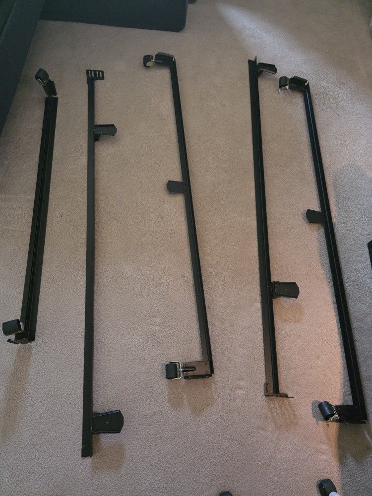 Selling King mattress metal frame. Like new onluly had it 1 month. Easy to put together, has wheels, great sturdy frame. Super easy to setup the rails have slots that atach to eachbother. No hardware or clamps. Easy setup and take apart. Asking $50