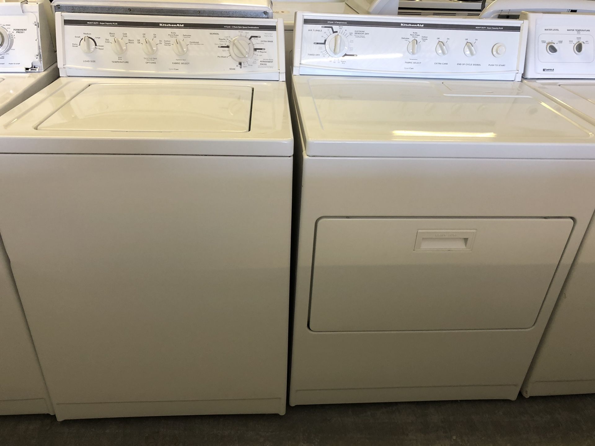 Matching Kitchen Aid super capacity plus washer dryer. Washer has 14 cycles 4 wash/spin speed combinations and optional extra rinse. Matching dryer has 8 cycles and 4 fabric care temperatures. Comes with 120 day warranty.