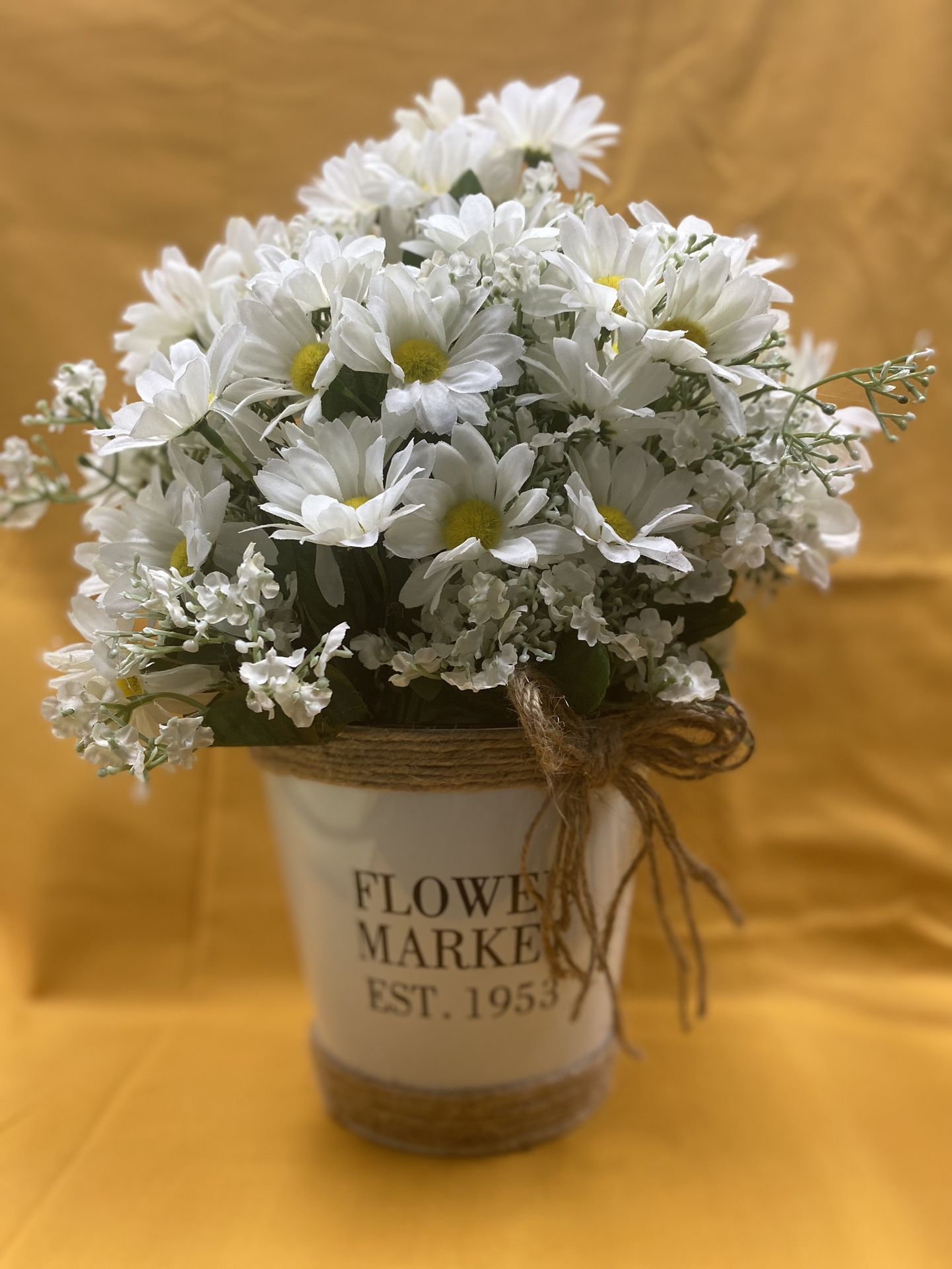 Daisy. Flower arrangement in metal tin with jute that says “flowers market establish 1953.”Measurements are 12 inches wide and 16 inches tall.