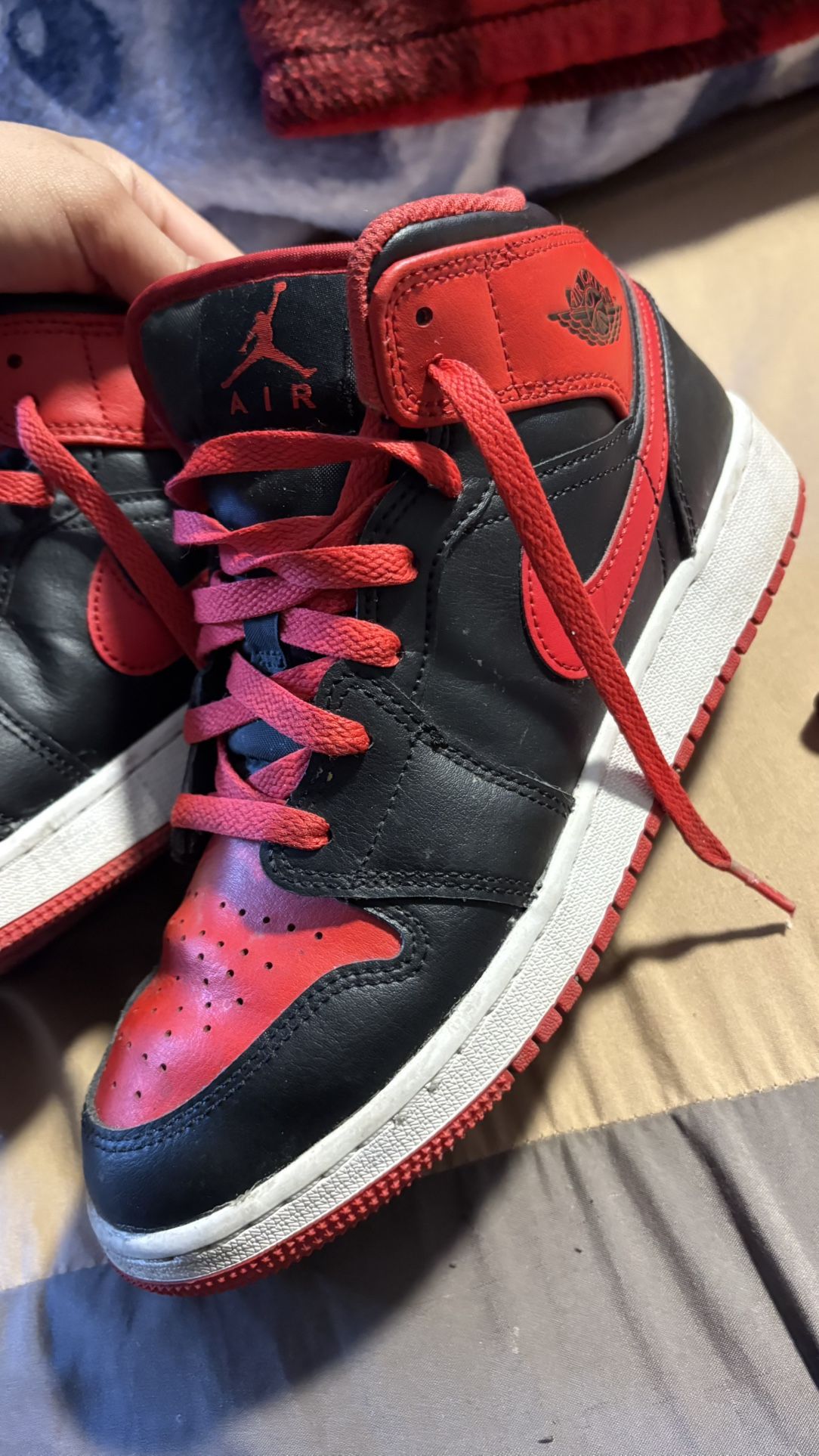 used Air Jordan 1 Mid in black/red Still in great condition, just normal wear. perfect for everyday outfits. Size 6. DM if interested!”