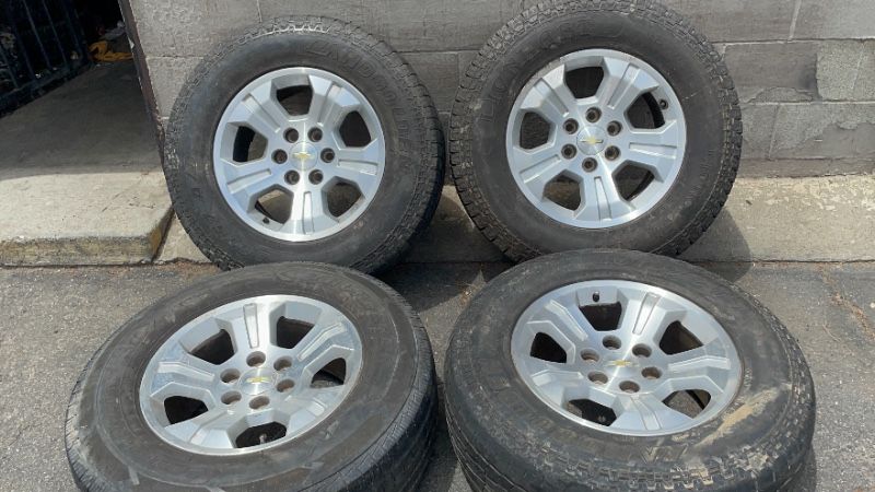 This is a set of four 18x8.5 inch aluminum wheels from a 2015 through 2020 Chevy Tahoe. The lug pattern is 6 on 5.5 inches which fits on Chevy Tahoe, Suburban, Silverado Avalanche, GMC Yukon, Sierra, Astro Van, Express Van and Savanna Van. The rims are in good condition no bends or cracks. The tires are old they are holding air and could get you by temporarily.