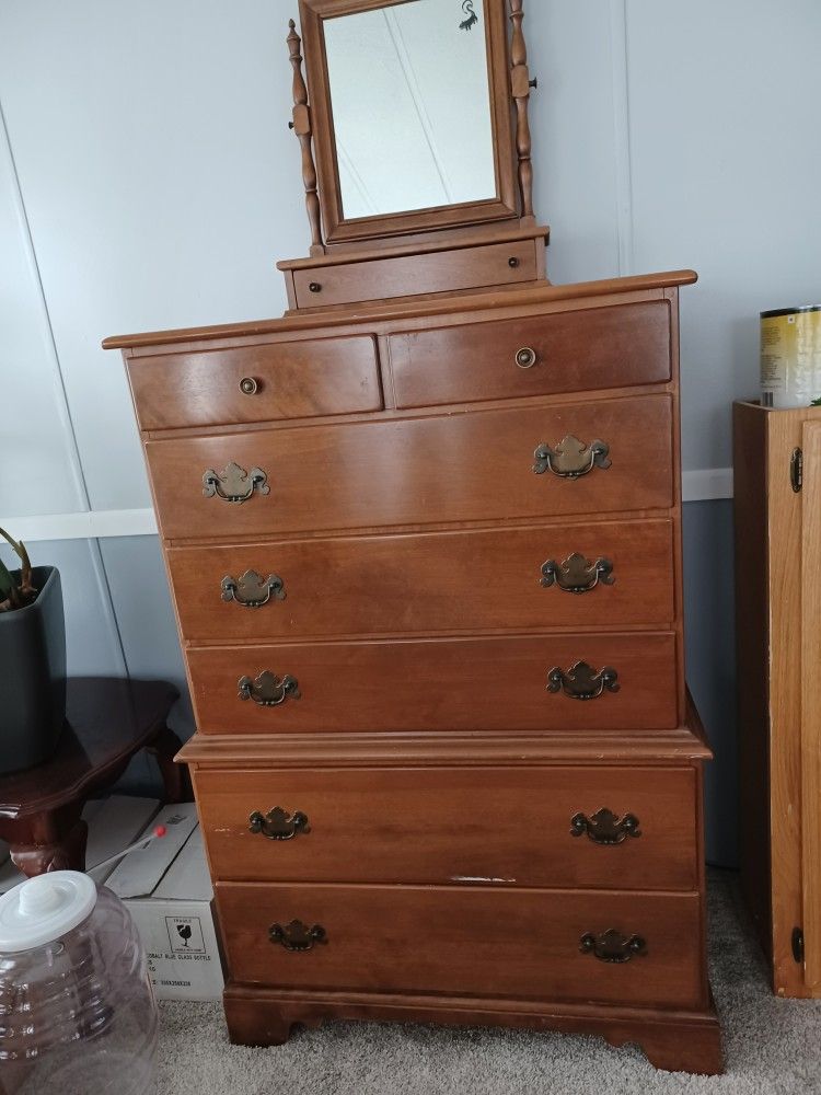 Ethan Allen 7 Drawer tall dresser.Solid Wood Maple finish. Separate Maple mirror with drawer.