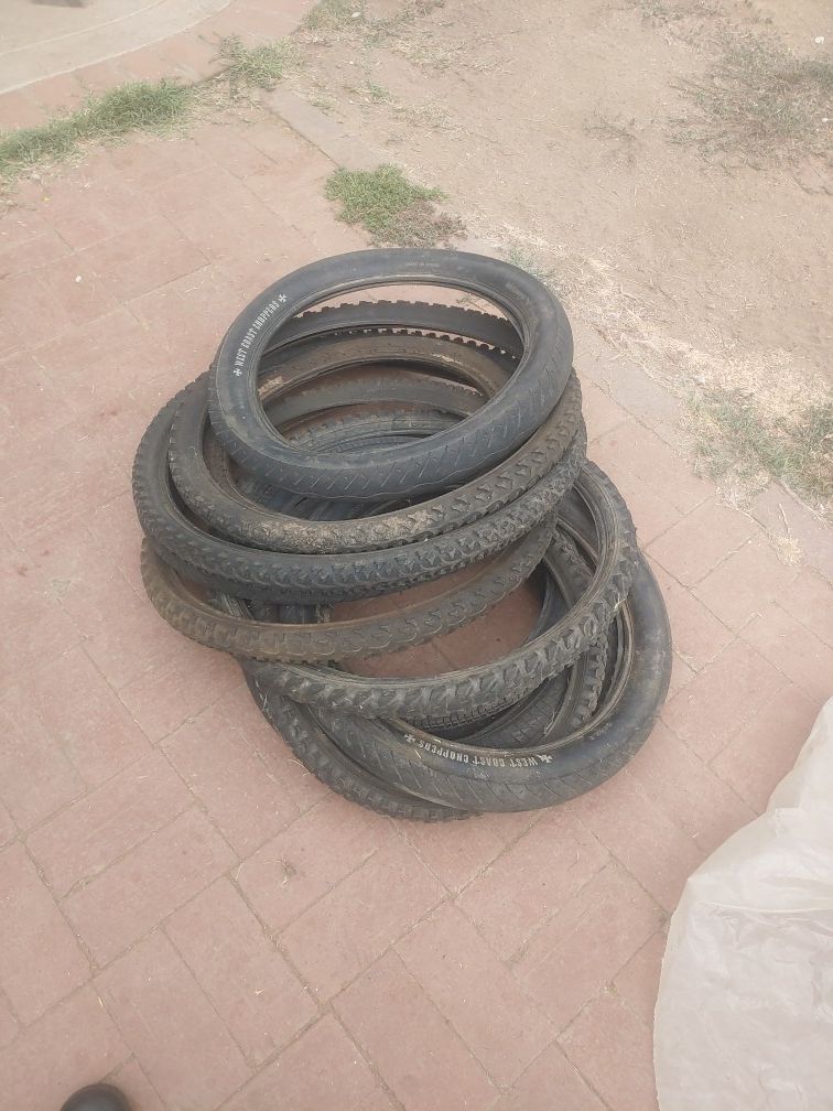A random assortment of bike tires ranging from size is 20 in to 24 inch BMX, Cruiser and mountain bike tires. Take all for 10 they are all in good condition and only have been in storage.