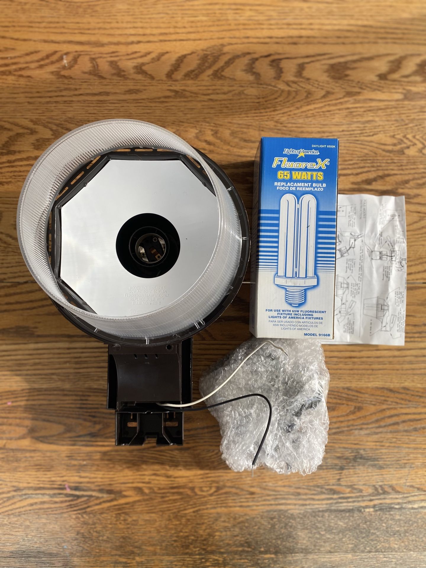 Lights of America Fluorex 65W fluorescent yard light (Model 9166). Complete set including fixture, bulb, mounting hardware, and original box. Good working condition with light cosmetic wear from storage. Lens is clear and housing is in solid shape. Great for outdoor security lighting, yard, garage, or commercial use. Sold exactly as shown in photos.