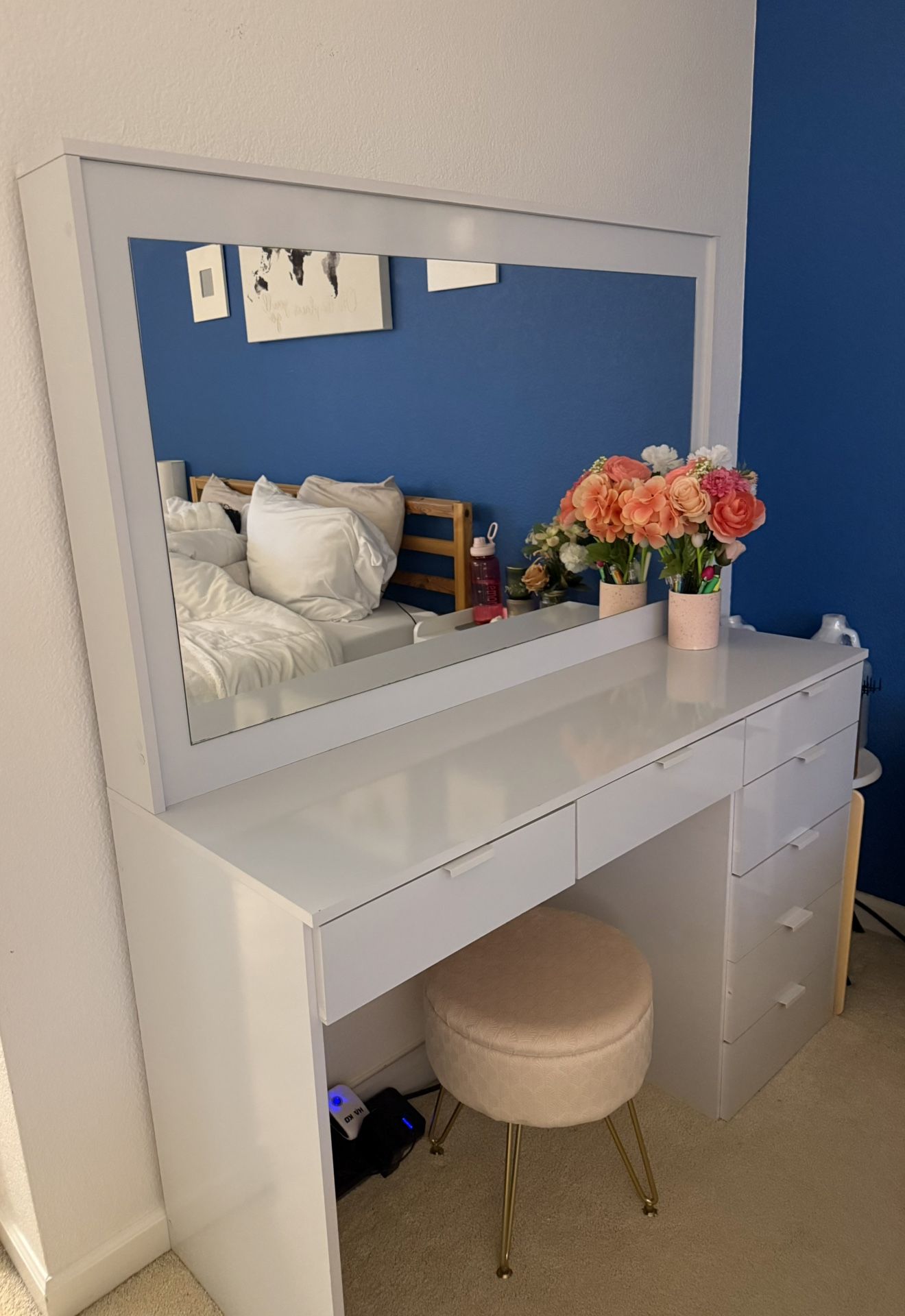 White vanity dresser table with 7 drawers, LOTS of storage space. Professionally built, very good quality and excellent condition. Well taken care of. Like new. No damage. It’s exactly like the pictures. Will require 2 people to carry. I do have 2 kinds of dolly available if needed to carry to your car. The stool is not included. Beige. Has storage space inside the stool. $30 for stool. 17.52 in (side) × 57.87 in (tall) × 47.24 in (wide)
