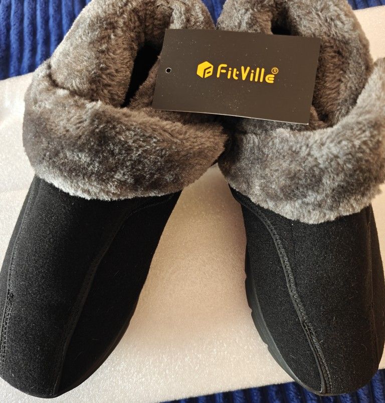 This is a pair of FITVILLE super warm boys or mens black winter shoe-boots. They are lined, open and close by secure velcro strip. These are size 8.5 or men, great for diabetics. These are $45 if purchased new in the U.S. The $28 price does not incliude shipping costs, which I estimate to be between $7 and $10. You can also pick these up in person in North Cambrdige, across the street from the Alewife T Station. * These were tried on at home but never worn outside because the buyer developed leg lymphdema. These shoe-boots are well made and SUPER warm. They can be water proof, so it's OK to wear them in ice and snow.