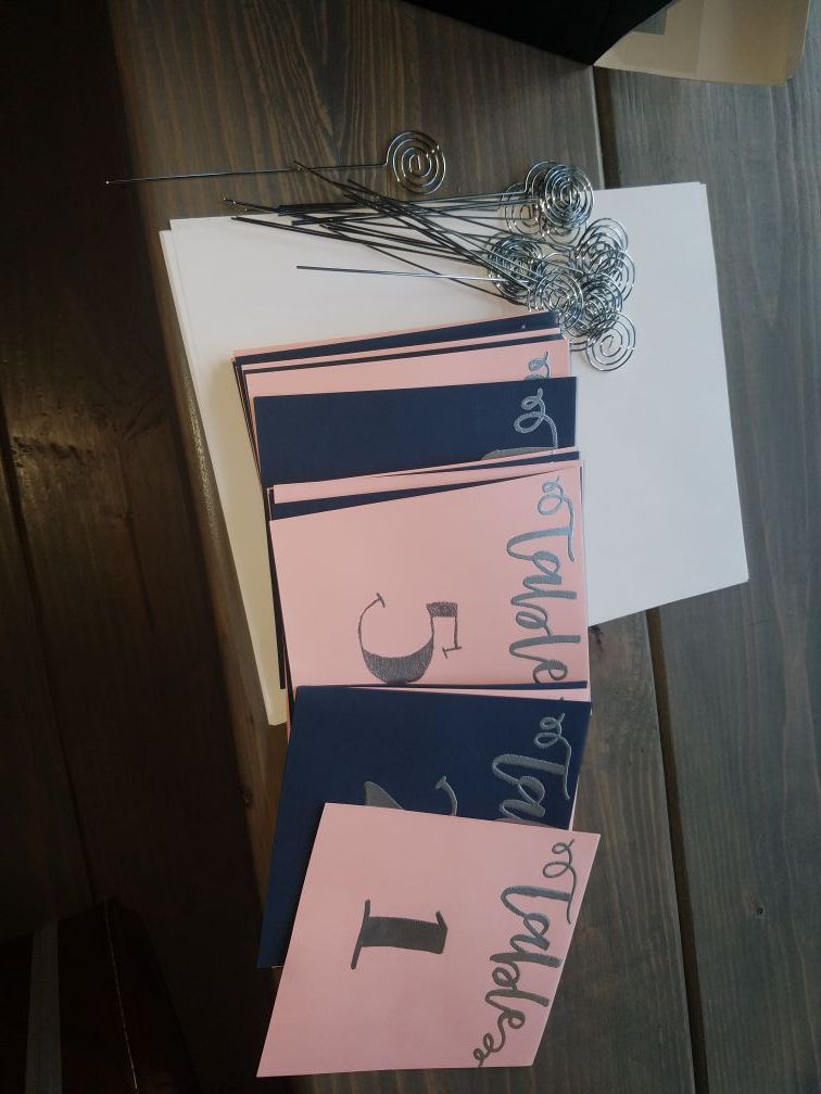 Beautiful handwritten table numbers in navy and pink for a wedding tables 1-25 with card holders as seen in the picture from our wedding.