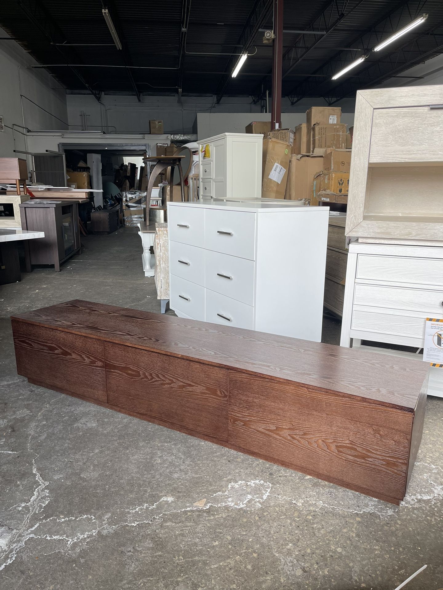 Online Price: $700 Our Price: $300 New 70 in. W X 11.2 In. H X 15.75 In. D Versatile Sizing Options Catering to diverse lifestyles, the one that best suits your space, complete with 3 drawers for ample storage solutions tailored to your needs. Premium Eco-Friendly Water-Based Paint Indulge in the silky smooth touch of our high-grade piano lacquer, which effortlessly repels dust and stains. Your TV stand remains a stunning centerpiece, retaining its vibrant, timeless hues as if newly arrived. Integration & Enhanced Aesthetics Designed to blend harmoniously with any living environment, our brown TV stand enhances the beauty of your space while providing a functional focal point. It's more than just a furniture piece; it's an expression of your refined taste and lifestyle. Natural Wood Veneer with Timeless Appeal Inspired by the warmth of natural wood grains, our TV stand embodies the charm of solid wood with unparalleled resilience. Its intricate detailing resists scratches and simplifies cleaning, allowing you to indulge in your entertainment without a care in the world. Sturdy Multi-Layered Solid Wood Beneath its elegant facade lies a solid foundation, meticulously crafted for unwavering durability. Tested by time, this base serves as a reliable platform for your multimedia needs, ensuring years of enjoyment.