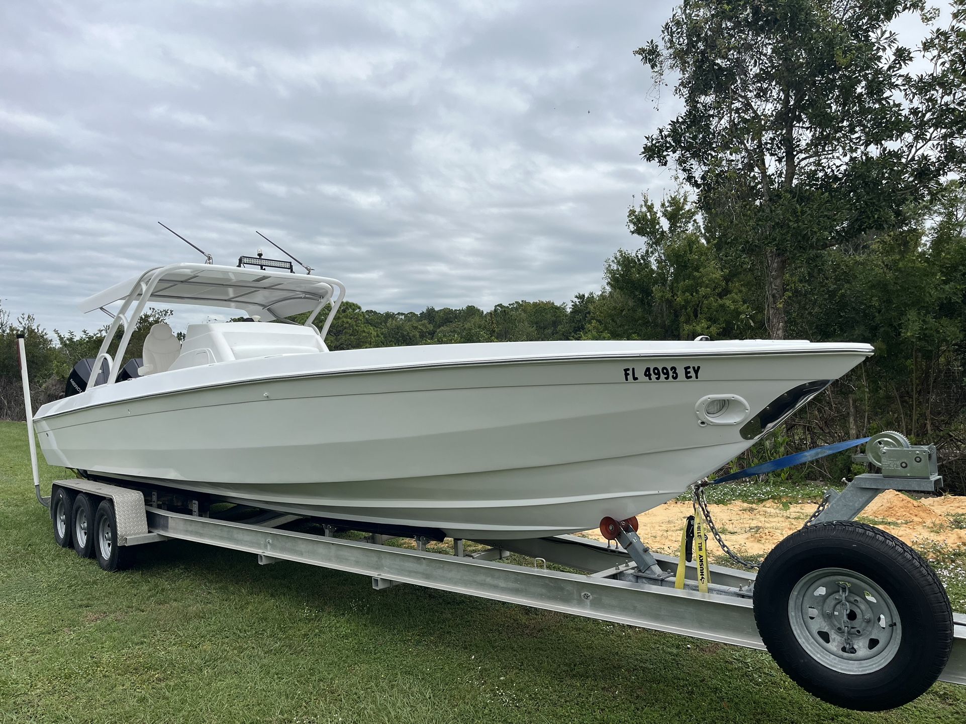 1985 scarab scorpion 32ft water ready. has 2 2020 mercury 250 outboards with aprox 130hrs. 2020 triaxle trailer. we barely use the boat. no soft spots.this boat was painted about a month ago with awl grip paint inside and out. it has a brand new 175 gallon aluminum fuel tank just installed {$3,500} with all lines replaced. comes with 2 new fish finders one is a lowrance ti2 and the other is a ray marine brand new. all lights work inside and out as well as on the trailer. PLEASE SERIOUS INQUIES ONLY AND NO REDICULOUS OFFERS. the boat is well taken care of and worth every penny. any additional photos needed please dm me. no trades call (contact info removed) gus