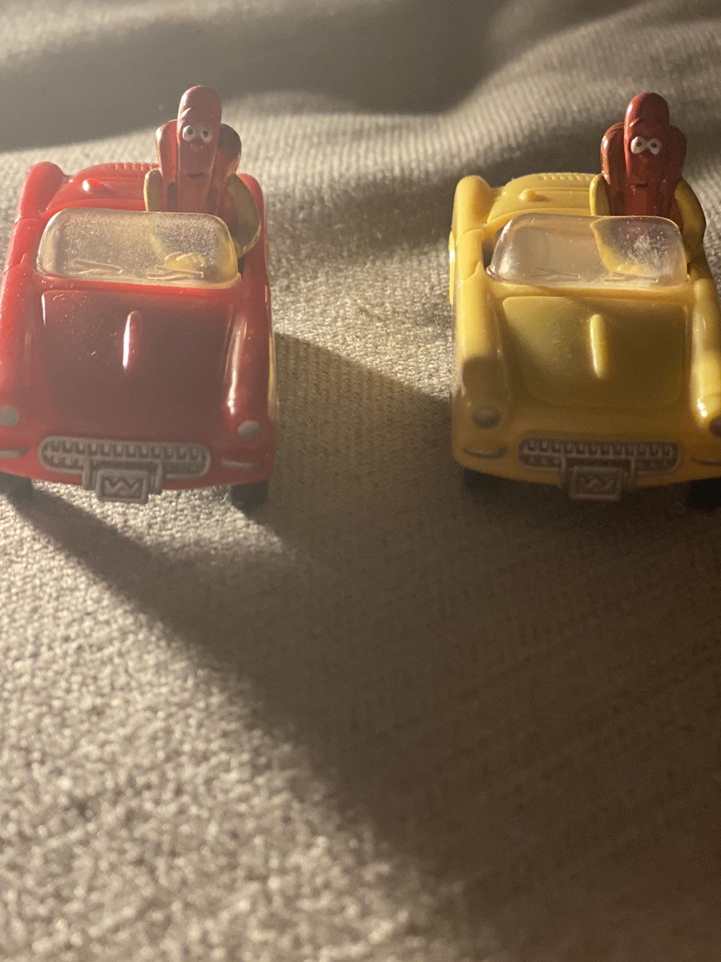 (2) Der Wienerschnitzel 2001 Yellow & Red Corvette Wiener Hot Dog Vehicle Car Fast Food Toy. Highly Collectible and in great condition.