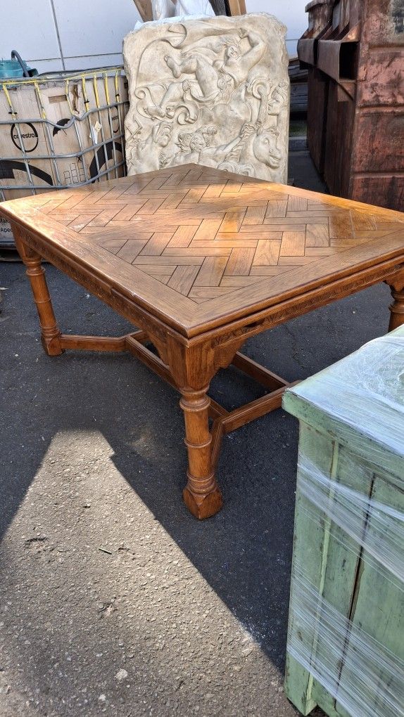 This dinning room table is large and heavy. Ends slide out to lengthen table. With ends in table is 62 in x 42 in. With ends out 96 in. Located in Oceanside. Pick up only. Cash.