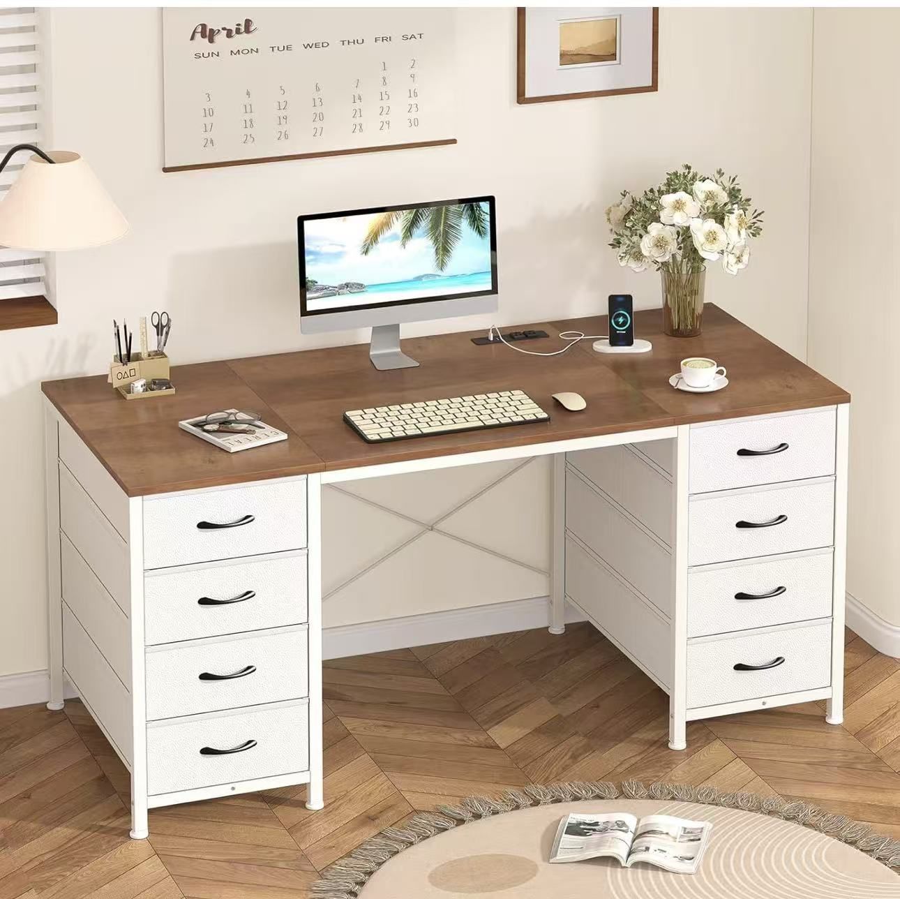 50 Inch Computer Desk with 8 Drawers, Home Office Desk with Power Outlets, Work Study Gaming Desk with 8 Fabric Drawers, Brown and White(CRD011-5A)