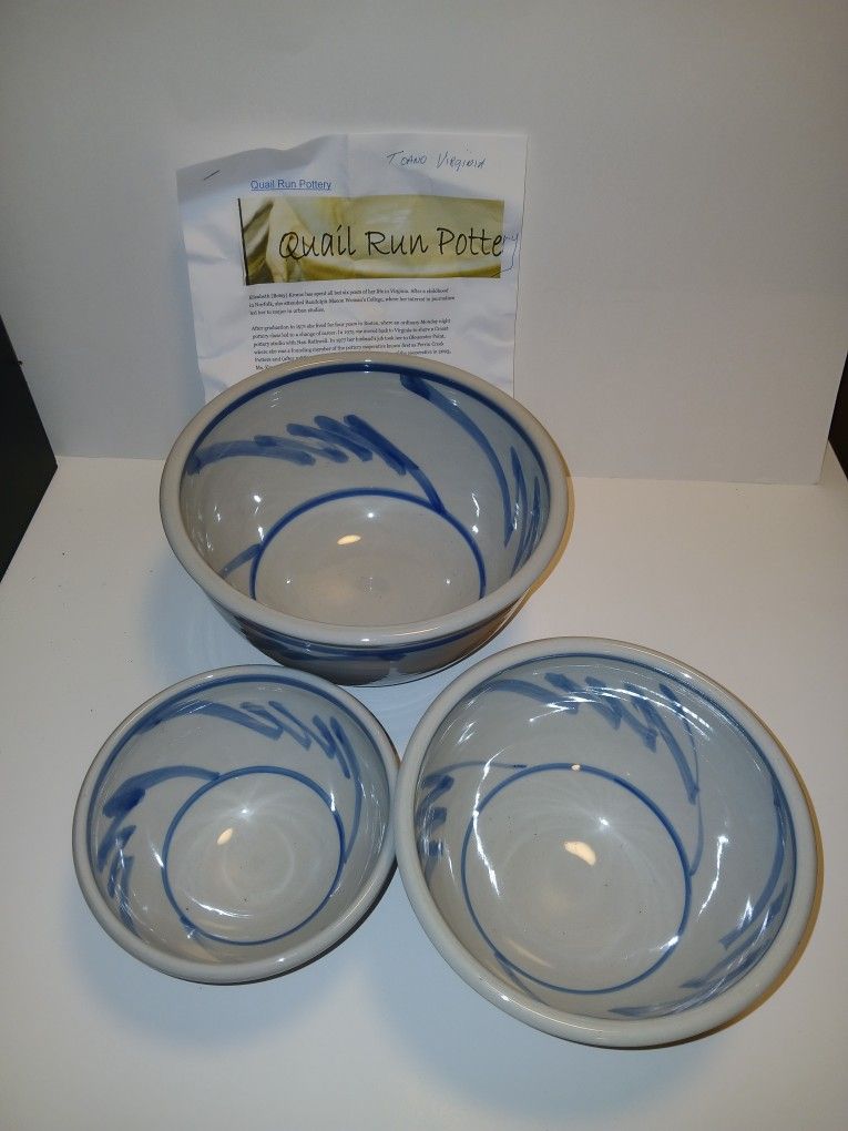 Quail Run Pottery By Elizabeth Krome 3 Pieces 3 piece bowls with blue swirl design. Big bowl is 8 3/4" wide 5" tall medium is 7 1/2" wide 4 1/4" tall small one is 6" wide and 3 1/2" tall 3 piece set is $40