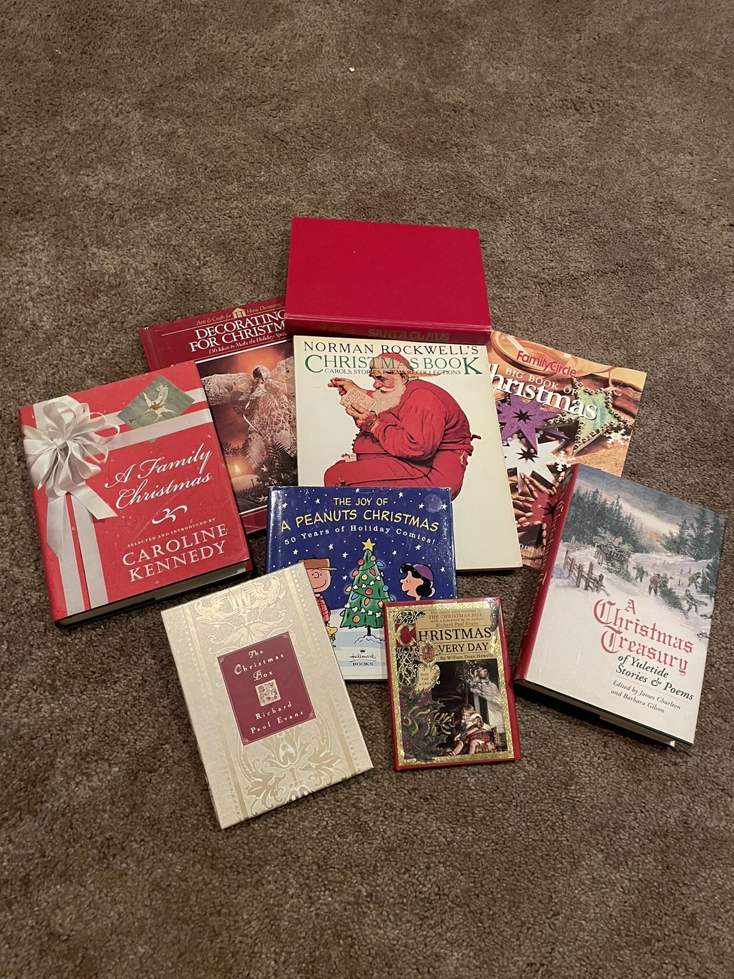 Lot of 9 Christmas books: 1. Norman Rockwell’s Christmas Book, Carols, Stories, Poems Recollections 2. A Family Christmas 3. A Christmas Treasury of Yuletide Stories & Poems 4. Decorating For Christmas 5. Family Circle Big Book of Christmas 6. The Joy of a Peanut Christmas 50 years of Holiday Comics 7. A Christmas Box 8. Christmas Everyday, A story told a child 9. The Life and Adventure of Santa Claus $40 or best offer!