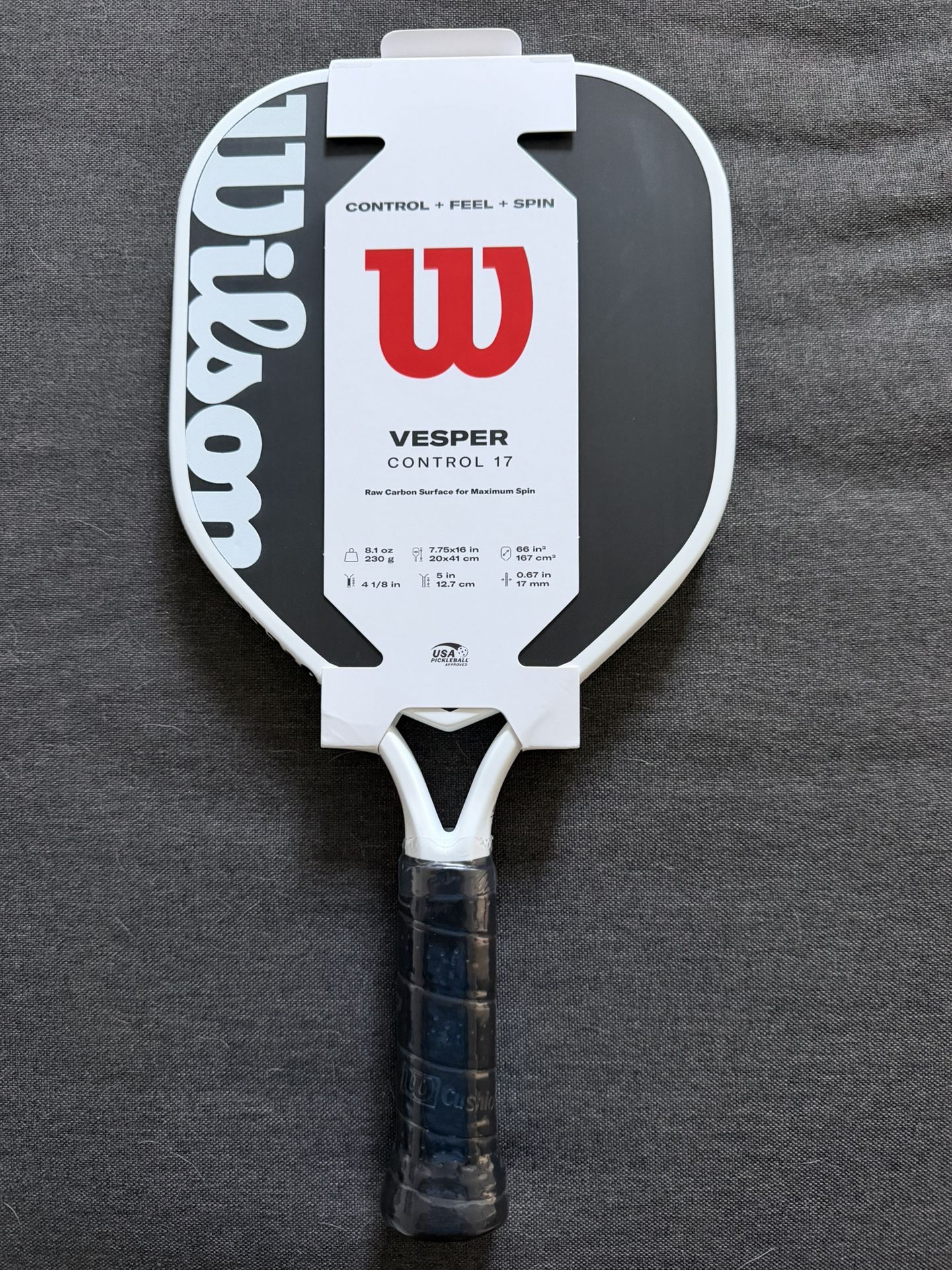 Retails for $249 Wilson's Vesper Control 17 Pickleball Paddle elevates control and precision for competitive players. The first-of-its-kind bladder-molded frame and open-throat design optimize compaction while introducing bending into the mix, resulting in performance-enhancing power, speed and maneuverability. The wide shape gives maximum control by expanding the sweet spot, and a hybrid handle length is crafted for maneuverability and two-handed backhands. The raw carbon face with a high-density foam core maximizes the sweet spot and gives you plenty of spin. Weight 8.1 oz. Head Size 66in² Thickness 17mm Dimensions 7.5 x 16 in . Grip Length 5 in. Grip Size 4 1/8"