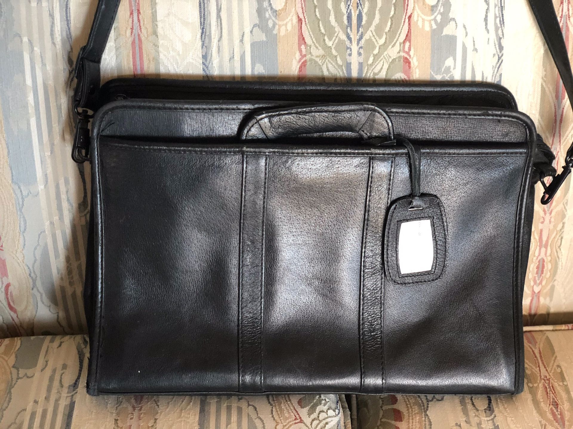 Black leather briefcase. 16” by 12”. Used.
