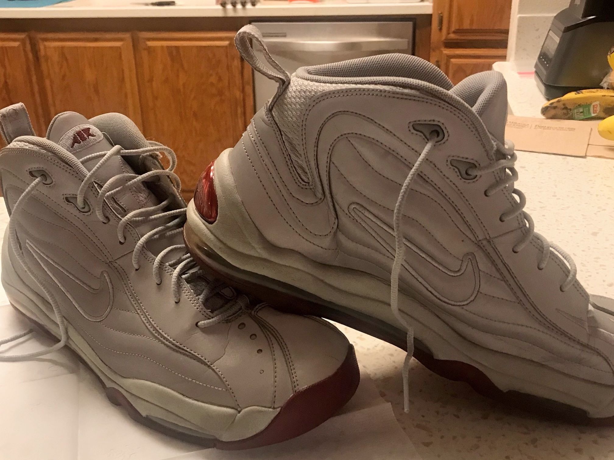 These are a great looking pair of Nike Reflective Air Total Max Uptempo 3M Attack Pack shoes, . They are in excellent condition, almost like new. These are well made durable shoes that are no longer available and sell over $450 when they were new. These come in a size 13. 366724 004 | metallic silver/metallic silver-team red are the colors. This pair will definitely stand out and catch your eye, as they feature a complete leather upper, which also sports a 3M reflective design. Nike decided to sit atop a grey midsole, and burgundy outsole, while the shoe also sports a full-length durable Air Max sole unit.