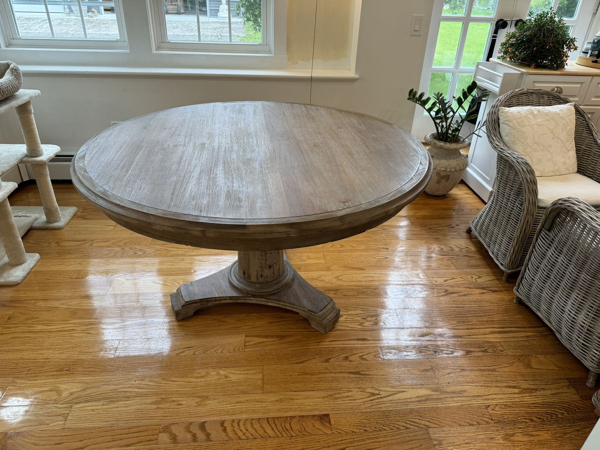 Dining Room table. 53” D. A few nicks underneath. Nothing noticeable. Top and base in perfect condition. Price Firm.