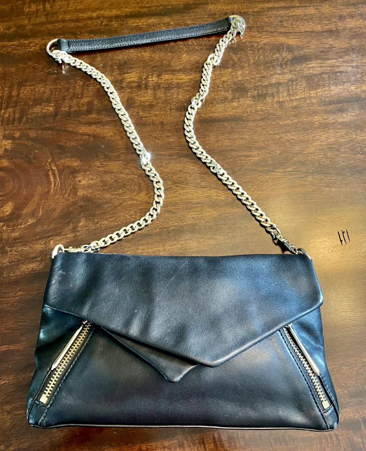 A sleek urban crossbody bag for the confident lady who's not afraid to step outside the box! This beauty has gold hardware that really stands out! Zippers on the front with a gold shoulder chain with black leather, to tie it all together. This bag is in like new condition inside and outside. There are a few scuffs on the front (see pics) but otherwise this bag is like new and ready to carry all your essentials wherever you go. Size: L-12" W-2.75" H-7" Shoulder Drop 23"