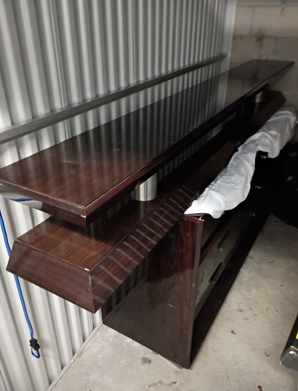 •Modern dark wood TV stand with shelf. Good condition with some minor wear. Works well for TVs, consoles, or storage. DM If interested đŸ“¥