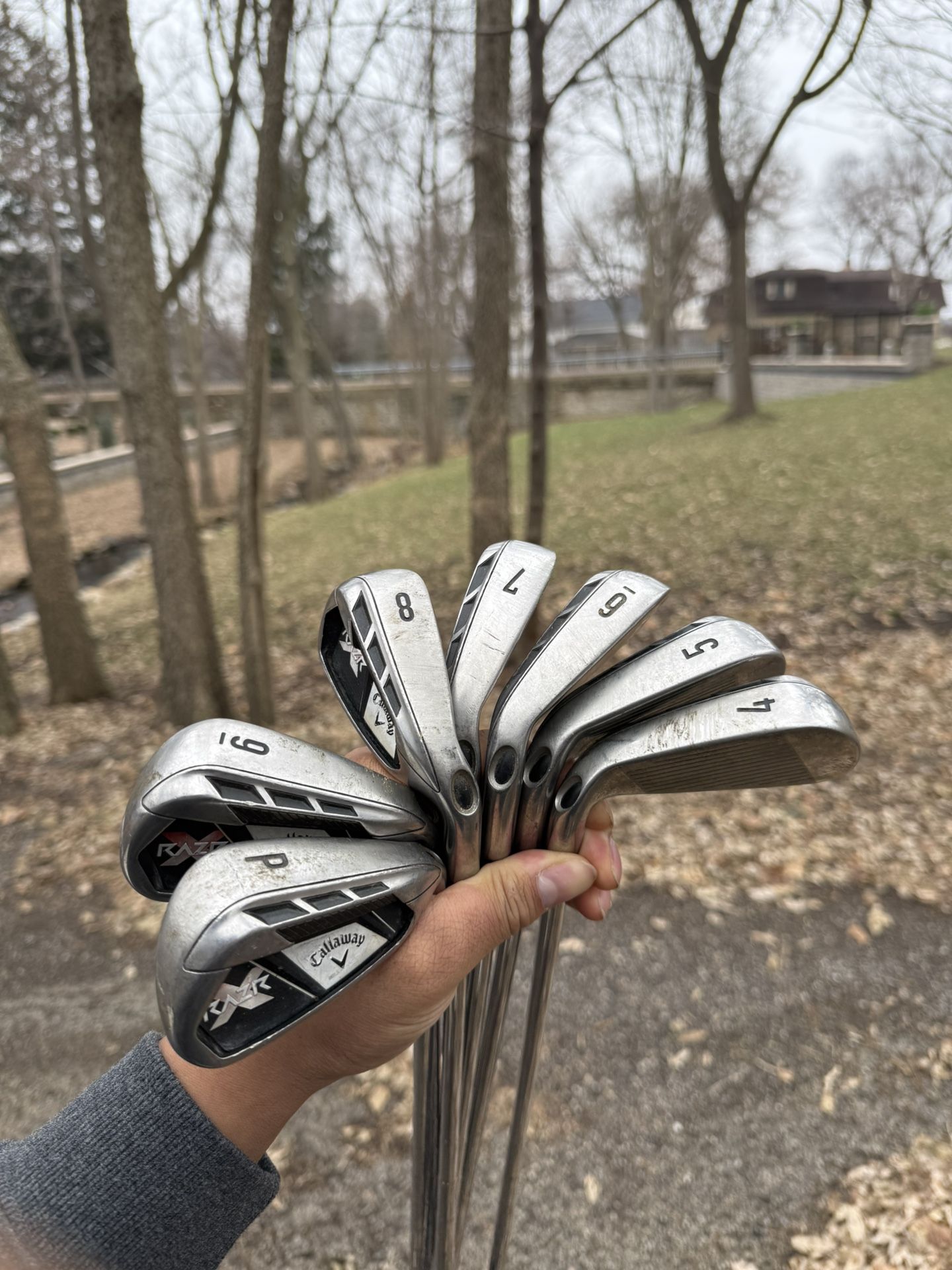 Got new clubs for Christmas! Sorry didn't wipe down the irons before pictures The set is great for someone with a faster swing, but also looking for some forgiveness. Athletes, young adults. Everything is x stiff Callaway Razer X irons 4-pw Cavity back (x stiff) Sad to see them go but glad someone will be using them You can come test them out check them out and ask any questions Some clubs could use regroup but that's about it Phenomenal set.