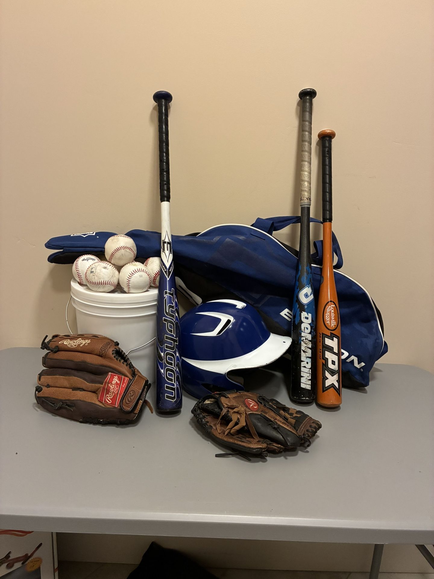 Youth t-ball, baseball package. Easton helmet size 6.5 to 7.5 blue and white. Easton baseball bag to hold vats, helmet, glove, and balls. Bat 26 inch, 25 oz, with 2 1/4 inch barrel. Easton 29” Typhoon bat -11. Demarini 29”, 17 oz, -12. Two Rawlings baseball gloves. Bucket of balls for batting practice. Also have rebounder and batting tee listed separately and may do package.