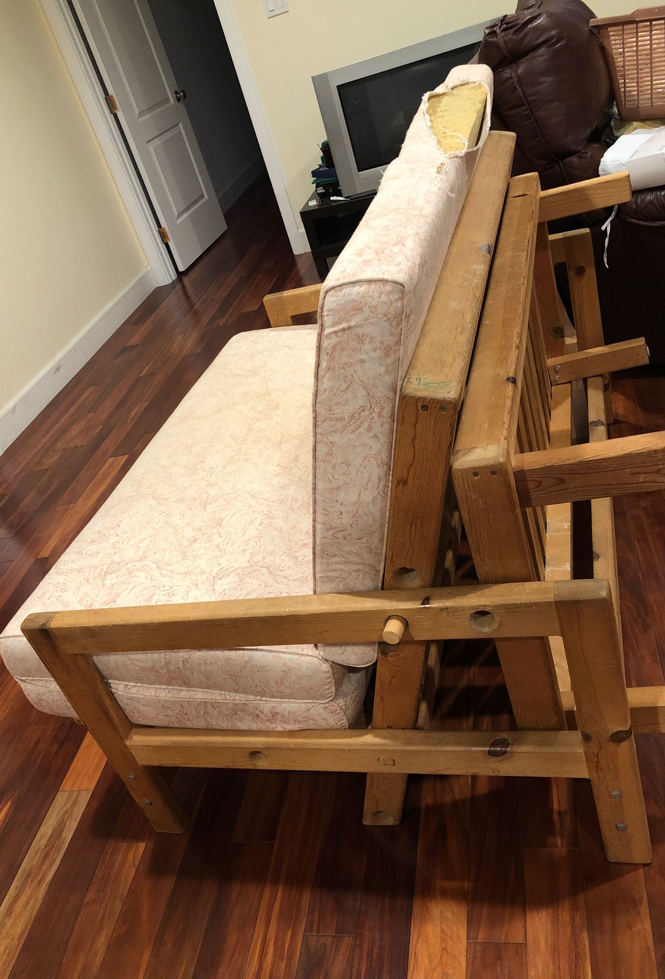 Solid wood. Mattress is ripped.
