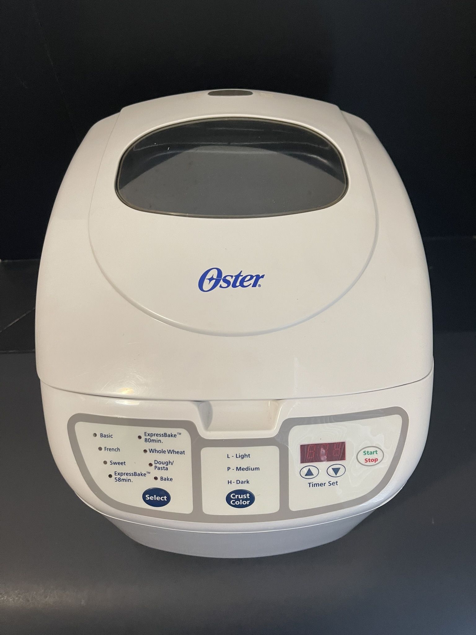 Efficient and Reliable Oster ExpressBake Bread Maker (Model 5838) Enjoy the aroma of freshly baked bread at home with this versatile Oster ExpressBake Bread Machine. This model is famous for its "ExpressBake" setting, which can produce a warm, delicious 2lb loaf in under an hour. Product Features: *ExpressBake™ Technology: Bakes bread in as little as 58 minutes. *Multiple Settings: Includes options for Basic, French, Sweet, Whole Wheat, and Dough/Pasta. *Crust Color Control: Choose from Light, Medium, or Dark crust settings. *13-Hour Delay Timer: Set it in the evening and wake up to fresh bread. *Large Capacity: Makes up to a 2lb loaf, perfect for families. *Easy Cleanup: Features a non-stick removable bread pan with a sturdy handle. Technical Specifications: Model No: 5838. Power: 560 Watts, 120V. Viewing Window: Large top window to monitor the baking process. Condition: This unit is in great pre-owned condition. The interior baking chamber and non-stick pan are clean and well-maintained. It has been power-tested and is fully functional.