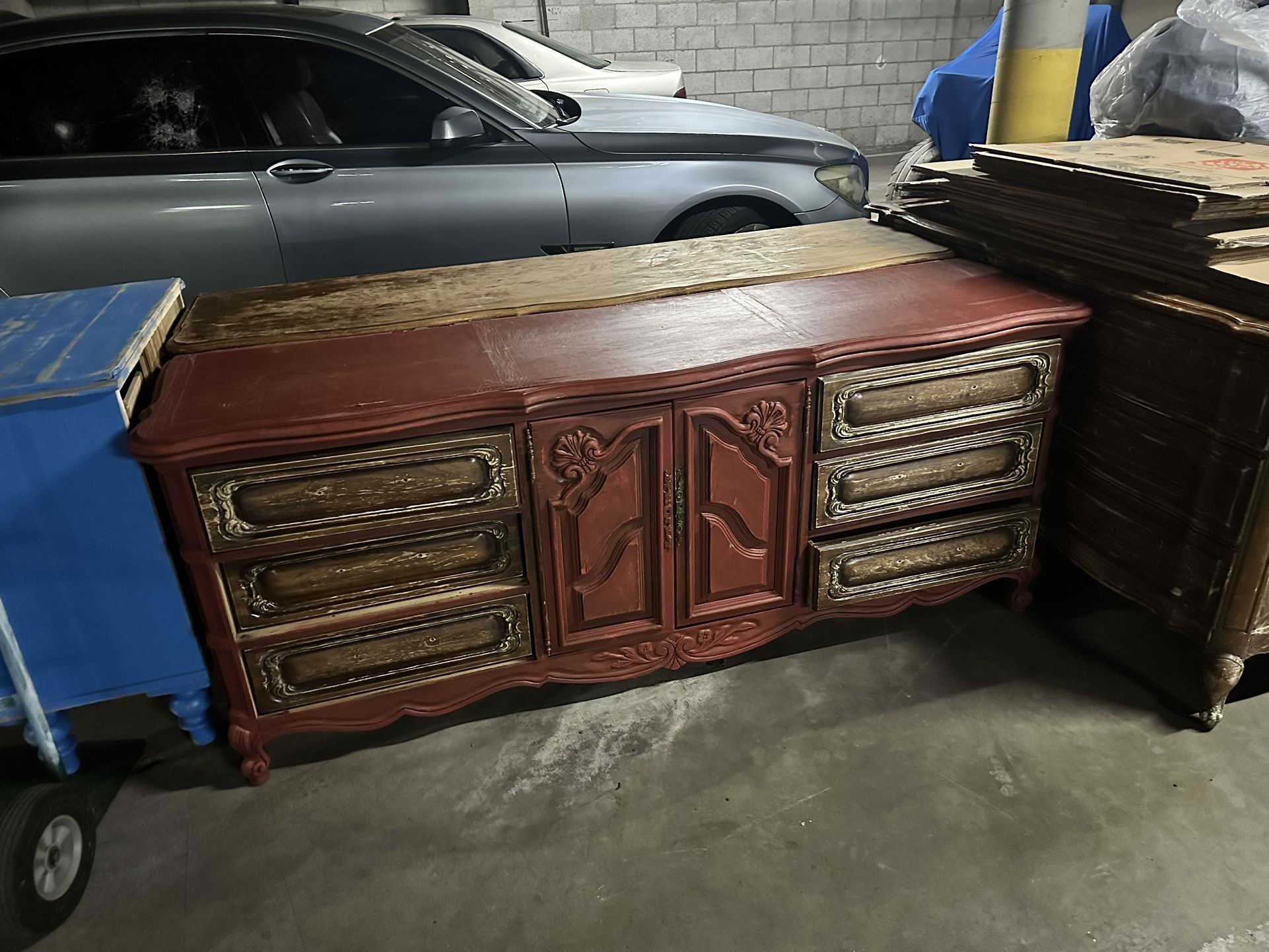 Another huge dresser I was going to repaint but do t have space anymore. The outside shell is painted red. But not the drawers. I was going to do black & white checkered design. I have all the hardware handles. It has to be sanded or refinished.