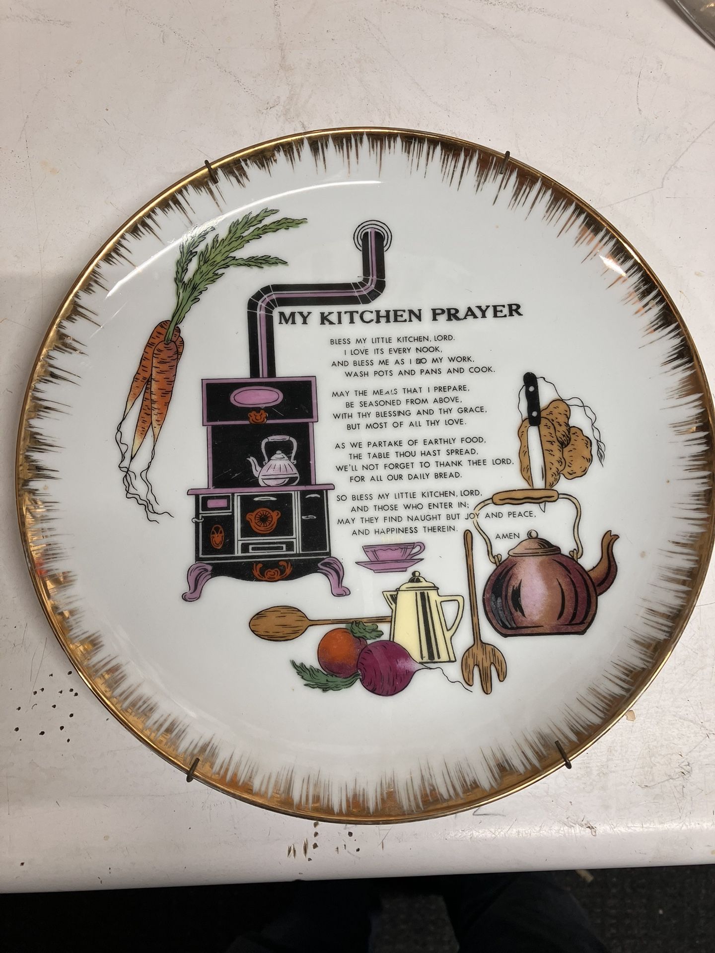 Elevate your collection with the Vintage ANCO of California Ceramic My Kitchen Prayer Plate, a charming piece that combines functionality with a dash of whimsy. This 10" round collector's item features a rustic, multicolor pattern that's sure to bring a touch of American culture to your display. The plate is adorned with a sophisticated gold trim, adding an elegant frame to its country-inspired design. Crafted from quality ceramic, this plate hails from the United States and showcases the fine craftsmanship of the ANCO brand Located in point Loma