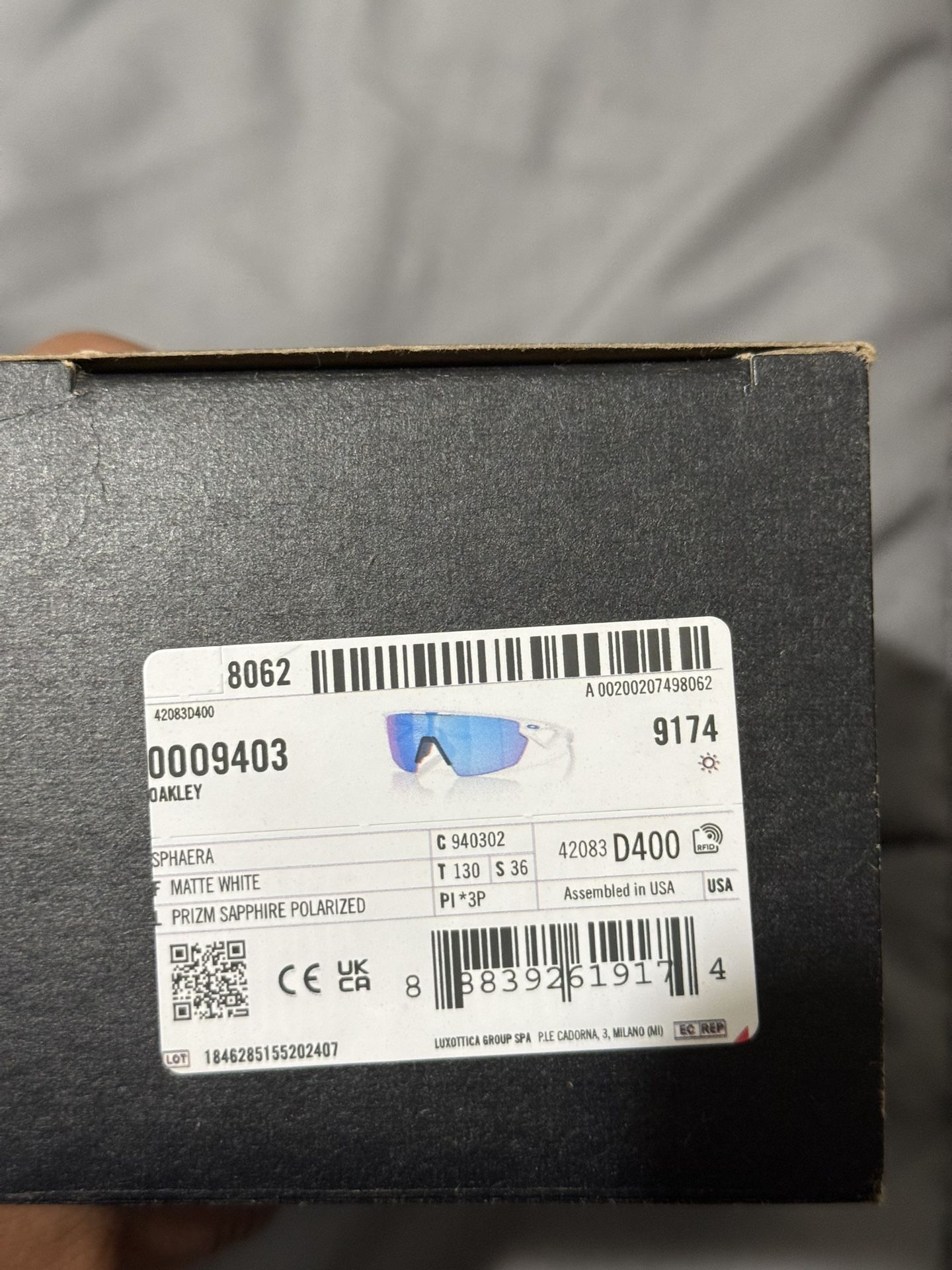 Brand new Oakley Sphaera sunglasses, Matte White frame with Prizm Sapphire Polarized lenses (model OO9403-02). Includes original box, case, and microfiber cloth. Never worn—perfect for sports, cycling, or everyday wear.